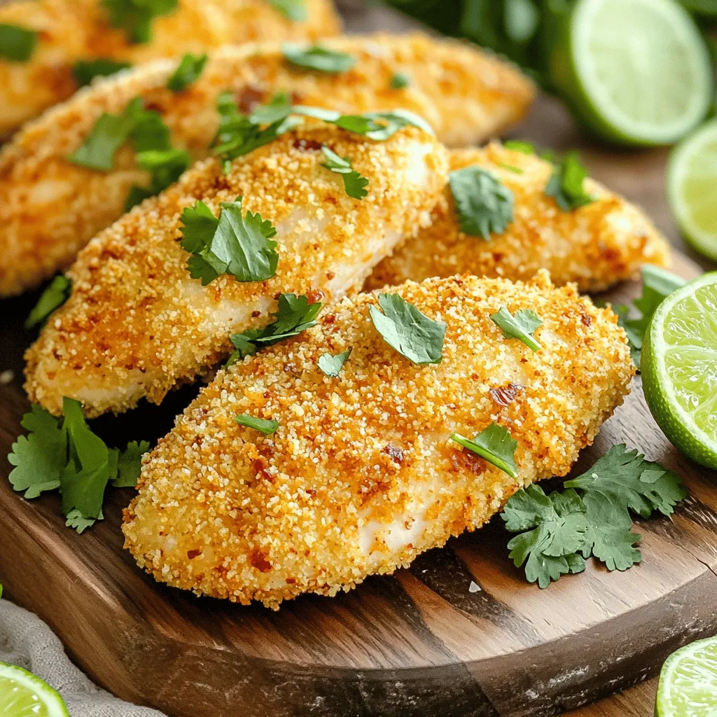 Once the air fryer is ready, place the breaded chicken tenders in the fryer basket in a single layer. If needed, cook in batches. Air fry the chicken for 10 to 12 minutes. Flip them halfway through cooking. They should turn golden brown and reach an internal temperature of 165°F (74°C). After cooking, let the chicken rest for a few minutes. Garnish with fresh cilantro and lime wedges. Enjoy your flavorful dish!
