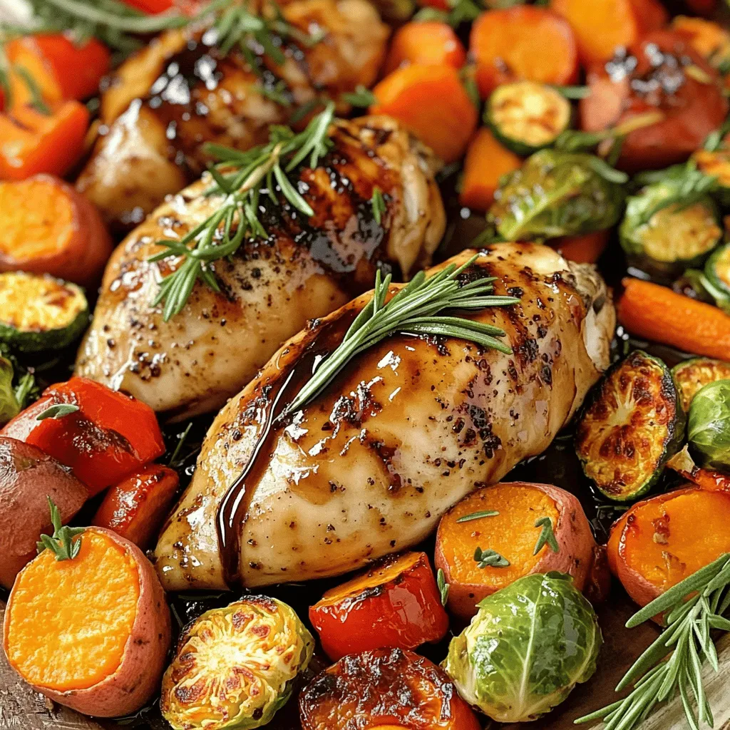 For this dish, gather these key items: - 4 boneless, skinless chicken breasts - 1/4 cup balsamic vinegar - 2 tablespoons honey - 3 tablespoons olive oil - 1 teaspoon Dijon mustard - 1 teaspoon garlic powder - Salt and pepper to taste The marinade brings flavor to the chicken. You will need: - 1/4 cup balsamic vinegar - 2 tablespoons honey - 3 tablespoons olive oil - 1 teaspoon Dijon mustard - 1 teaspoon garlic powder - Salt and pepper to taste Choose vibrant autumn vegetables for color and taste. Here’s what to use: - 1 large sweet potato, peeled and cubed - 2 carrots, sliced - 1 red bell pepper, chopped - 1 zucchini, sliced - 1 cup Brussels sprouts, halved - Fresh rosemary sprigs for garnish Using these ingredients, you create a tasty and healthy meal. The sweet potato adds a soft texture, while the Brussels sprouts give a nice crunch. The chicken soaks up the rich balsamic flavor, making each bite delightful. Remember, fresh ingredients make a big difference! Start by preheating your oven to 400°F (200°C). This step is key for even cooking. While the oven heats, line a large sheet pan with parchment paper. This makes cleanup quick and easy. In a small bowl, whisk together the balsamic vinegar, honey, olive oil, Dijon mustard, garlic powder, salt, and pepper. This mixture adds great flavor. Place the chicken breasts in a zip-top bag or shallow dish. Pour the marinade over the chicken, making sure it’s well coated. Let it marinate for at least 30 minutes. If you have more time, let it sit in the fridge for up to 2 hours. While the chicken marinates, it’s time to prep the veggies. In a large bowl, toss the cubed sweet potato, sliced carrots, chopped red bell pepper, sliced zucchini, and halved Brussels sprouts. Drizzle with olive oil and season with salt and pepper. Make sure every piece is evenly coated for the best flavor. Once the chicken has marinated, remove it from the bag or dish. Discard the marinade. Place the chicken breasts on one side of the sheet pan. Next, arrange the prepared veggies on the other side. This layout helps everything cook evenly. Now, it’s time to roast! Place the sheet pan in your preheated oven. Roast for 25 to 30 minutes. The chicken should reach an internal temperature of 165°F (74°C). The veggies will become tender and caramelized, adding a lovely sweetness. After roasting, carefully remove the sheet pan from the oven. Let the chicken rest for a few minutes. This helps keep it juicy. Slice the chicken and garnish with fresh rosemary sprigs. Serve it alongside the vibrant autumn veggies. To make the chicken flavorful, marinating is key. I mix balsamic vinegar, honey, olive oil, Dijon mustard, garlic powder, salt, and pepper. The sweet and tangy blend gives the chicken a delicious taste. For best results, marinate for at least 30 minutes. If you have time, let it sit for two hours. This allows the chicken to soak up the flavors. Roasting veggies can bring out their natural sweetness. Start by cutting the sweet potato, carrots, red bell pepper, zucchini, and Brussels sprouts into even pieces. This ensures they cook at the same rate. Toss them with olive oil, salt, and pepper. Spread them on the sheet pan in a single layer. This helps them roast evenly and get that lovely caramelized look. Presentation is important. After cooking, let the chicken rest for a few minutes. This keeps it juicy. Slice the chicken and arrange it on a colorful platter. Place the roasted veggies around it for a vibrant look. Drizzle any leftover balsamic glaze from the pan over the dish. This adds a nice touch and enhances the flavor. {{image_2}} You can mix up the veggies in this dish. Try adding butternut squash or parsnips for a twist. If you have leftover veggies in your fridge, toss them in. Broccoli, cauliflower, or even asparagus work great too. Just cut them into similar sizes for even cooking. While chicken is a star here, you can swap in turkey or pork. For a lighter option, use boneless skinless fish like salmon or cod. Just adjust cooking time to avoid overcooking. Each protein brings its own flavor, so feel free to experiment. Want to amp up the flavor? Add fresh herbs like thyme or oregano. You can also toss in a pinch of red pepper flakes for some heat. A sprinkle of smoked paprika adds depth too. Adjust the marinade by adding orange juice for a citrusy kick. These tweaks can make your dish unique and exciting! To keep your Balsamic Chicken with Autumn Veggies fresh, place leftovers in an airtight container. Make sure they cool down first. You can store it in the fridge for up to three days. This helps maintain the flavors and texture. When ready to eat, reheat the chicken and veggies in the oven. Set the oven to 350°F (175°C). Place the dish in for about 15-20 minutes. This method keeps the chicken juicy and the veggies tender. You can also use a microwave. Heat in short bursts of 1-2 minutes. Stir in between for even heating. If you want to save some for later, freezing is a great option. First, let everything cool down completely. Then, place the chicken and veggies in a freezer-safe bag or container. Remove as much air as possible. Label it with the date. You can freeze it for up to three months. When ready to eat, thaw in the fridge overnight before reheating. You can serve Balsamic Chicken with many sides. Here are some great options: - Rice or quinoa for a hearty grain. - A fresh green salad for crunch. - Garlic bread for extra flavor. - Mashed potatoes for creaminess. These sides balance the tangy chicken and veggies well. The chicken should marinate for at least 30 minutes. For best results, let it soak for up to 2 hours. This helps the flavors soak in deeply. If you are short on time, even a quick 30-minute soak will work. Yes, you can use other types of vinegar. Apple cider vinegar adds a fruity touch. Red wine vinegar gives a rich flavor. Each type will change the taste a bit, but they all work well. This recipe serves 4 and has roughly: - Cal