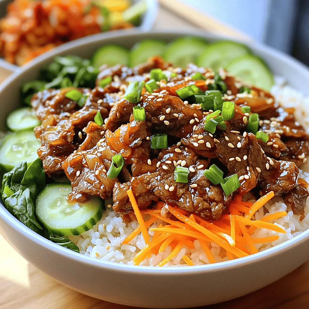 To make Beef Bulgogi Bowls, you need these main ingredients: - 1 lb beef sirloin, thinly sliced - 1/4 cup soy sauce - 2 tablespoons brown sugar - 1 tablespoon sesame oil - 3 cloves garlic, minced - 1-inch piece ginger, grated - 1/4 teaspoon black pepper - 2 green onions, chopped (plus more for garnish) - 1 tablespoon sesame seeds - 2 cups cooked jasmine rice - 1 cup shredded carrots - 1 cup sliced cucumbers - 1 cup baby spinach - Kimchi (optional, for serving) These ingredients come together to create a wonderful flavor. The beef sirloin gives a nice texture. The marinade adds a sweet and savory taste. For an extra touch, consider these optional ingredients: - Extra green onions, chopped - More sesame seeds - Sliced radishes - Avocado slices These garnishes not only enhance the look but also add fresh flavors. You can change some ingredients based on what you have: - Use chicken or tofu instead of beef for a different protein. - Swap jasmine rice with brown rice or quinoa for a healthier choice. - If you don't have ginger, garlic powder works in a pinch. These swaps let you customize your bowls while keeping the essence of the dish. Experimenting with flavors is part of the fun! Start by making the marinade. In a bowl, mix these ingredients: - 1/4 cup soy sauce - 2 tablespoons brown sugar - 1 tablespoon sesame oil - 3 cloves garlic, minced - 1-inch piece ginger, grated - 1/4 teaspoon black pepper This mixture will add depth and flavor to your beef. The brown sugar gives a sweet touch. The garlic and ginger add a nice kick. Next, add the beef to the marinade. Use 1 lb of thinly sliced beef sirloin. Mix well so the beef is coated. Cover the bowl and place it in the fridge. Let it marinate for at least 30 minutes. If you have time, leave it overnight for even more flavor. Now, it's time to cook the beef. Heat a large skillet over medium-high heat. Stir-fry the marinated beef in batches for about 5-7 minutes. Look for it to be cooked through and slightly caramelized. While the beef cooks, prepare your serving bowls. Start with 2 cups of cooked jasmine rice at the bottom. Then, add the cooked beef on top. Layer in shredded carrots, sliced cucumbers, and a handful of baby spinach. For the finishing touch, sprinkle chopped green onions and sesame seeds on top. You can also add kimchi on the side if you like a little extra zing. Enjoy your delicious Beef Bulgogi Bowls! To make the best bulgogi, focus on the marinade. Use fresh ingredients for the best taste. Mix soy sauce, brown sugar, sesame oil, minced garlic, grated ginger, and black pepper. Let the beef soak in this mix. You can marinate for 30 minutes or overnight. The longer, the better the flavor. When cooking the beef, use medium-high heat in a large skillet. This helps the meat cook fast and stay tender. Cook in small batches to avoid steaming. Stir-fry for about 5-7 minutes. Watch for the beef to caramelize slightly. This adds a nice texture and flavor. Layer your bowls for a great look. Start with a cup of jasmine rice. Next, add the stir-fried beef. Top it with shredded carrots, sliced cucumbers, and baby spinach. Garnish with green onions and sesame seeds for extra flair. Adding kimchi on the side gives it a spicy kick. Enjoy your beautiful meal with chopsticks! {{image_2}} You can easily turn this beef dish into a vegetarian delight. Use mushrooms as a main ingredient. Shiitake or portobello mushrooms work great. They soak up flavors well and have a nice texture. Tofu is another option. Choose firm tofu, press it, and cut it into cubes. Marinate it just like the beef. You can add extra veggies, like bell peppers and zucchini, for color and crunch. This gives you a tasty vegetarian bulgogi bowl. If you want to mix it up, try other proteins. Chicken is a great alternative. Use chicken thighs for juiciness. Thinly slice them and marinate just like the beef. Pork is also a tasty choice. Use pork shoulder for a rich flavor. You can even use shrimp; just marinate briefly, as shrimp cooks fast. Each protein brings its unique taste and texture to the bowl. Add more flavor with simple tweaks. Try adding a splash of rice vinegar for tang. You can also mix in gochujang for heat. This Korean chili paste adds depth and spice. Fresh herbs like cilantro or mint can brighten the dish. Don’t forget toppings! Roasted seaweed, pickled radishes, or extra sesame seeds can make your bowl even better. These small changes can elevate your beef bulgogi bowls to new heights. To store leftovers, let your beef bulgogi cool first. Then, place it in an airtight container. You can keep it in the fridge for up to three days. For best results, store the beef separately from the rice and veggies. This helps keep everything fresh. When you are ready to enjoy your leftovers, reheat them gently. Use a skillet over low heat. Add a splash of water to keep the beef moist. Stir it often to heat evenly. If you prefer, you can use a microwave. Heat in short bursts, stirring in between. This keeps the flavor intact. If you want to keep your beef bulgogi for a while, freezing is a great option. Place cooled beef in a freezer-safe bag. Squeeze out as much air as you can. Label the bag with the date. You can freeze it for up to three months. When you are ready to eat, thaw it in the fridge overnight. Reheat as mentioned before for the best taste. Bulgogi is a popular Korean dish. It features marinated beef grilled to perfection. The word "bulgogi" means "fire meat" in Korean. It often uses thinly sliced sirloin or ribeye. The marinade includes soy sauce, garlic, and sesame oil. This mix creates a sweet and savory flavor. The beef cooks quickly, making it a fast meal option. Yes, you can make Beef Bulgogi ahead of time. Marinating the beef can boost its flavor. You can marinate it for 30 minutes or up to overnight. If you prep the beef in advance, it saves time later. Cook the beef just before serving for the best taste. Leftover beef is still tasty the next day. To adjust the