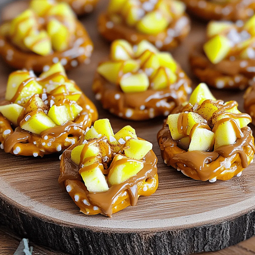 ![To make caramel apple pretzel bites, you will need the following ingredients: - Mini Pretzel Twists: Use 1 cup of classic mini pretzel twists for a crunchy base. - Apple Selection: Choose 1 large Granny Smith apple. Core and dice it into small pieces for a tart flavor. - Caramel Sauce: Get 1 cup of caramel sauce. You can use store-bought or make your own for a richer taste. - Additional Ingredients: - 1/2 cup semi-sweet chocolate chips for a sweet drizzle. - 1/4 teaspoon sea salt to enhance flavor. - 1 teaspoon cinnamon for a warm spice note. - 1/4 cup chopped pecans or walnuts (optional) for extra crunch. These ingredients create a perfect blend of sweet and salty. They bring out the best in each other, making your treat delightful. For the full recipe, check out the details earlier. 1. Preheating the oven: Start by setting your oven to 350°F (175°C). This is the perfect heat for baking your pretzel bites. A hot oven helps the pretzels warm and the apples soften just right. 2. Preparing the baking sheet: Line your baking sheet with parchment paper. This step is key. It keeps the pretzels from sticking and makes cleanup super easy. 1. Tossing apples with cinnamon and salt: In a small bowl, mix your diced apple with one teaspoon of cinnamon and a pinch of sea salt. This step adds flavor and balance. The salt brings out the sweetness of the apples. 2. Heating caramel sauce: Take your caramel sauce and place it in a microwave-safe bowl. Heat it for about 30 seconds. This makes the caramel warm and pourable. Stir it well so it becomes smooth and easy to drizzle. 1. Coating the pretzels: Spread the mini pretzel twists on your lined baking sheet. Drizzle the warm caramel sauce over the pretzels. Make sure each pretzel gets an even coat. This way, every bite will taste sweet and delicious. 2. Baking time and temperature: Bake your pretzel bites for 10 to 12 minutes. Keep an eye on them. You want the pretzels warm and the apples slightly soft. When they look perfect, take them out of the oven and let them cool before serving. For the full recipe, refer to the provided list. Enjoy making these delightful treats! To achieve a perfect caramel drizzle, start with warm caramel sauce. Heat it gently in the microwave. Stir to keep it smooth. Drizzle it over the pretzels while it is still warm. This helps it spread evenly. Preventing pretzels from getting soggy is key. Make sure to coat the pretzels lightly. Too much caramel can lead to a mushy mess. After drizzling, add the apple pieces quickly. Bake them right away. This keeps the pretzels crunchy. To boost flavor, consider adding spices. A pinch of nutmeg or allspice can elevate the taste. These spices pair well with caramel and apples. Optional toppings add fun textures. Try adding crushed graham crackers for a pie vibe. Chopped pecans or walnuts give a nice crunch. You can also sprinkle some sea salt on top for contrast. These extras make your treat even more delightful. For the Full Recipe, check out the main article! {{image_2}} You can change the taste by using different apple types. Each apple has a unique flavor. Granny Smith apples give a tart taste. Honeycrisp apples are sweet and crunchy. Fuji apples are sweet and juicy. Try a mix for a fun twist! You can also use various toppings. Chopped pecans add crunch and flavor. Walnuts bring a rich taste. For a sweeter bite, try crushed almonds. Each nut gives a new twist to the pretzel bites. Want to make it gluten-free? Use gluten-free pretzels. They taste just as good! You can also make these bites vegan. Replace the caramel sauce with a vegan version. Look for plant-based chocolate chips too. If you want less sugar, try sugar alternatives. Agave syrup or maple syrup works well. These options keep the flavor but reduce sugar. You can enjoy the treat without guilt! For the full recipe, check out the [Full Recipe]. To keep your caramel apple pretzel bites fresh, store them in an airtight container. Glass or plastic containers work well. You can also use resealable plastic bags. Make sure to remove as much air as possible before sealing. This helps prevent them from becoming soft. You can keep them at room temperature for up to two days. If you want to keep them longer, place them in the fridge. They will last for about a week when refrigerated. Just remember, the colder they get, the more the caramel may harden. To enjoy these bites warm again, you can reheat them easily. Use your oven or microwave. If using the oven, preheat it to 300°F (150°C). Place the pretzel bites on a baking sheet and heat them for about 5-7 minutes. This keeps the pretzels crispy and the caramel soft. If using a microwave, heat them for about 10-15 seconds. Be careful not to overheat, as this can make the pretzels chewy. Enjoy your treats warm for the best flavor! How to make the caramel sauce from scratch? To make caramel sauce, start with sugar. Heat it in a pan over low heat. Stir until it melts and turns golden. Next, add butter and cream, stirring until smooth. This homemade sauce is rich and tasty! Can I substitute the chocolate chips with something else? Yes, you can use white chocolate or butterscotch chips. You could also skip the chocolate and top with extra nuts. Get creative with flavors that you enjoy! What are the best apples to use for this recipe? Granny Smith apples are the best choice. They are tart and balance the sweet caramel. Other good options are Honeycrisp or Fuji apples for a sweeter bite. Ideal occasions and pairings for caramel apple pretzel bites Caramel apple pretzel bites are perfect for parties, fall gatherings, or movie nights. Pair them with warm cider or hot chocolate for a cozy treat. They bring a fun twist to any event! How to serve them for maximum presentation Serve the bites on a colorful platter. Drizzle extra caramel and chocolate over them for a nice look. You can sprinkle a few nuts on top for texture and flavor. Caloric intake per serving Each serving has around 200 calorie