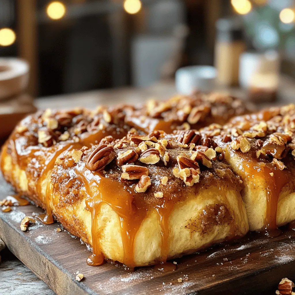 - 2 cups warm milk (110°F) - 1/2 cup granulated sugar - 2 packets (4.5 teaspoons) active dry yeast - 1/2 cup unsalted butter, melted - 4 large eggs - 5-6 cups all-purpose flour - 1 teaspoon salt - 1 cup pecans, chopped - 1 cup brown sugar, packed - 1/2 cup light corn syrup - 1/4 cup unsalted butter (for caramel) - 1 teaspoon vanilla extract - 1 teaspoon ground cinnamon - 1/4 teaspoon nutmeg (optional) Each ingredient serves a unique role. You can swap some items but keep the basics. For milk, use almond or oat milk if needed. Instead of butter, try coconut oil for a dairy-free option. For eggs, use flaxseed meal mixed with water as a vegan substitute. If you want fewer nuts, leave out the pecans or use walnuts. - Warm Milk: Activates the yeast for good rise. - Granulated Sugar: Feeds the yeast, helping the dough rise. - Active Dry Yeast: Gives the dough its fluffy texture. - Unsalted Butter: Adds richness and flavor to both dough and caramel. - Eggs: Contribute to the dough's structure and moisture. - All-Purpose Flour: Forms the base of the dough. - Salt: Balances sweetness and enhances flavors. - Pecans: Add crunch and a nutty taste. - Brown Sugar: Creates a rich, deep sweetness for the caramel. - Light Corn Syrup: Prevents crystallization in the caramel. - Vanilla Extract: Adds warmth and depth to the taste. - Ground Cinnamon: Provides warmth and a cozy flavor. - Nutmeg: Offers a hint of spice (optional but nice). Each ingredient plays a key role in making caramel pecan sticky buns a tasty treat! To start, combine 2 cups of warm milk, 1/2 cup of granulated sugar, and 2 packets of active dry yeast in a large bowl. Stir gently. Let it sit for 5 to 10 minutes. You want it to get frothy. This step wakes up the yeast and helps the dough rise. Next, melt 1/2 cup of unsalted butter and add it to the yeast mix. Crack in 4 large eggs. Gradually mix in 5 cups of all-purpose flour and 1 teaspoon of salt. Use your hands or a spatula to combine everything into a dough. Knead the dough on a floured surface for about 5 to 7 minutes. It should feel smooth and elastic. Add more flour if it’s sticky. Now, place the dough in a greased bowl. Cover it with a damp cloth. Set it in a warm spot and let it rise for about 1 hour. It should double in size. This is key for light and fluffy buns. In a small saucepan, mix 1 cup of packed brown sugar, 1/2 cup of light corn syrup, and 1/4 cup of unsalted butter. Add 1 teaspoon of vanilla extract. Cook this over medium heat until it boils. Stir often for about 2 to 3 minutes. Remove from heat and mix in 1 cup of chopped pecans. This sauce will give your buns that sticky goodness. After the dough has risen, punch it down gently. Roll it out on a floured surface into a rectangle, about 1/2 inch thick. Brush the dough with melted butter. Sprinkle on brown sugar, 1 teaspoon of ground cinnamon, and optional nutmeg. Roll the dough tightly into a log. Cut the log into 12 equal pieces. Place these pieces cut-side down over the caramel in your greased baking pan. Cover them and let the pieces rise again for about 30 minutes. They will puff up nicely during this time. Preheat your oven to 350°F (175°C). Bake the buns for 25 to 30 minutes. You want them golden brown on top. Keep an eye on them to avoid overbaking. Once baked, let the buns cool in the pan for about 5 minutes. Carefully invert the pan onto a serving platter. This lets the caramel drizzle over the buns. Serve them warm for the best gooey experience. Enjoy every bite of this sweet delight! To get the best dough, the warmth of the milk matters. Use warm milk around 110°F to help the yeast activate. When mixing the dough, start with 5 cups of flour. You can add more flour if the dough is too sticky. Knead the dough for about 5-7 minutes until it feels smooth and elastic. This gives the buns a soft and fluffy texture. You can enhance flavor with a few simple tweaks. Try adding a pinch of nutmeg for warmth. A splash of vanilla extract in the dough brings a lovely aroma. For a twist, you can mix in chocolate chips or dried fruit to the filling. These additions create layers of taste that make each bite special. Watch out for over-kneading the dough. This can make the buns tough. Also, don’t skip the rising times. If the dough doesn’t rise enough, the buns will be dense. Lastly, ensure your oven is preheated. If it's not hot enough, the buns won’t bake evenly and may end up soggy. {{image_2}} If you want to skip the nuts, you can make nut-free sticky buns. Simply leave out the pecans in the recipe. You can replace the pecans with seeds such as sunflower or pumpkin seeds for a crunch. Another option is to add raisins or dried cranberries for some sweetness. You can easily add flavors to your sticky buns. For a hint of citrus, add the zest of an orange or lemon to the dough. To make chocolate sticky buns, sprinkle mini chocolate chips between the dough layers before rolling. You can also experiment with spices like cardamom or ginger to change the flavor profile. For a healthier twist, you can use whole wheat flour instead of all-purpose flour. This adds fiber and nutrients. You can also reduce the sugar by half. Try substituting honey or maple syrup for some of the brown sugar. For a dairy-free option, use almond milk instead of regular milk and coconut oil instead of butter. To keep your caramel pecan sticky buns fresh, let them cool completely. Place them in an airtight container. You can store them at room temperature for up to three days. If you want to keep them longer, refrigerate them for up to a week. Make sure to wrap them well to prevent drying. When you're ready to enjoy the leftovers, preheat your oven to 350°F (175°C). Place the buns on a baking sheet. Cover them with foil to keep them soft. Heat for about 10-15 minutes, just until warm. You can also use a microwave. Heat each bun for about 20-30 seconds. This method is quick but can make them a bit chewy. If you want to save some buns for later