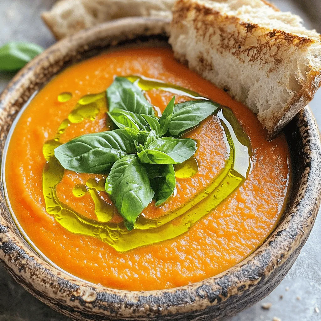 - 4 large carrots, peeled and chopped - 4 ripe tomatoes, roughly chopped - 1 medium onion, diced - 3 cloves garlic, minced - 1 teaspoon fresh ginger, grated - 1 teaspoon ground cumin - 1 teaspoon smoked paprika - 1 tablespoon olive oil - Salt and pepper to taste - Fresh basil leaves For this carrot tomato soup, I focus on fresh, simple ingredients. Each one adds a unique flavor. Carrots bring sweetness and a nice texture. Tomatoes add acidity and brightness. Onions and garlic give depth. Ginger adds warmth and a bit of spice. The spices are important too. Ground cumin provides earthiness. Smoked paprika adds a hint of smokiness. I use olive oil for richness. Salt and pepper enhance all the flavors. For garnish, I love fresh basil. It adds a bright green touch and fresh flavor. You can skip this if you don’t have it, but it makes the soup look pretty. These ingredients not only combine well but also offer great nutrition. Carrots are rich in vitamins. Tomatoes provide antioxidants. Together, they create a soup that is both tasty and good for you. - Start by peeling and chopping 4 large carrots. - Roughly chop 4 ripe tomatoes. - Dice 1 medium onion. - Mince 3 cloves of garlic. - Grate 1 teaspoon of fresh ginger. - Measure 4 cups of vegetable broth. - Gather 1 teaspoon of ground cumin, 1 teaspoon of smoked paprika, and salt and pepper to taste. - Have 1 tablespoon of olive oil ready. - Set aside fresh basil leaves for garnish. - In a large pot, heat the olive oil on medium heat. - Add the diced onion and sauté it for about 5 minutes until it softens. - Stir in the minced garlic and grated ginger. Cook for 1 more minute until fragrant. - Next, add the chopped carrots and tomatoes to the pot. - Sprinkle in the ground cumin and smoked paprika. Stir everything well to mix. - Pour in the vegetable broth and bring it to a boil. - Once boiling, lower the heat and let it simmer for 25-30 minutes. The carrots should be tender. - Remove the pot from heat. Use an immersion blender to puree the soup until smooth. - If you prefer, transfer it in batches to a blender for the same result. - Return the soup to the pot. Season with salt and pepper to taste. Heat through if needed. - Serve the soup hot. - Garnish each bowl with fresh basil leaves for a pop of color. - This soup pairs well with crusty bread or a light salad for a complete meal. To make your soup even tastier, try adding spices. Ground coriander or red pepper flakes can add warmth and depth. You can also add cream or coconut milk for a rich finish. This will give your soup a smooth, creamy texture. When it comes to blending, you have options. An immersion blender is easy and quick. You can blend the soup right in the pot. A stand blender works too, but it requires more cleanup. Just blend in batches to avoid spills. If you want a thicker soup, add more carrots. Cooking them longer also helps. For a thinner soup, add more broth or water. Adjust until you find the right thickness for your taste. {{image_2}} For vegan versions of carrot tomato soup, you can make a few easy swaps. First, substitute vegetable broth with a rich mushroom broth for depth. This change adds an earthy flavor that pairs well with carrots and tomatoes. Next, consider adding plant-based proteins. You can use lentils or chickpeas, which boost nutrition and make the soup heartier. If you need a gluten-free soup, focus on your ingredients. Avoid any broth that contains gluten. Always check labels on store-bought items. For a twist, you can add quinoa instead of any grains. It is gluten-free and adds a nice texture. You can enhance the flavor of your carrot tomato soup with herbs. Try adding thyme or oregano for a fresh taste. These herbs work well with the sweetness of carrots and the acidity of tomatoes. If you want to switch things up, replace the tomatoes with other vegetables. Zucchini or bell peppers can add a unique flavor while keeping the soup vibrant and delicious. To store leftovers, let the soup cool first. Once cooled, pour it into an airtight container. This helps keep the soup fresh. You can store it in the fridge for about 3 to 5 days. Make sure to check for spoilage before eating. Freezing is a great option for longer storage. I recommend using freezer-safe containers or bags. Leave some space at the top of the container as the soup will expand. You can freeze the soup for up to 3 months. When you are ready to eat it, thaw it in the fridge overnight or use cold water for quicker thawing. You have a couple of options for reheating. For stovetop, pour the soup into a pot and heat over medium heat. Stir often until it’s hot. If you use a microwave, pour the soup into a microwave-safe bowl. Heat in 1-minute intervals, stirring in between to ensure even heating. Both methods work well, so choose what fits your time best. To add heat, consider these options: - Add a pinch of cayenne pepper. - Stir in some red pepper flakes. - Use a spicy tomato variety. - Toss in chopped jalapeños or serranos. These spices boost flavor and heat. Start with small amounts, then taste as you go. You can always add more spice, but it’s hard to fix if it’s too hot. Yes, you can use canned tomatoes. Here are some pros and cons: Pros: - Canned tomatoes save time. - They are often more affordable. - They have a long shelf life. Cons: - Canned tomatoes may taste less fresh. - They can be higher in sodium. - Texture can differ from fresh tomatoes. If you choose canned tomatoes, look for no-salt-added options to control flavor. This soup packs a healthy punch. Here are key vitamins and minerals: - Vitamin A: From carrots, great for vision and skin. - Vitamin C: Found in tomatoes, boosts the immune system. - Potassium: Helps regulate blood pressure. - Fiber: Aids in digestion and keeps you full. With these nutrients, carrot tomato soup is not only tasty but also a smart choice for good health. This article covered how to make a delicious carrot tomato soup. We discussed key ingredients
