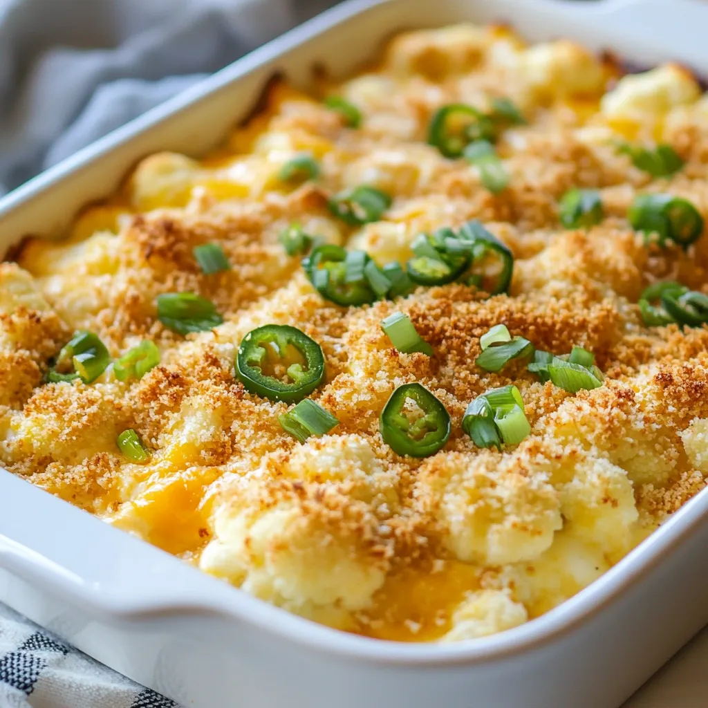 A creamy and cheesy casserole featuring cauliflower and jalapeños, topped with crunchy breadcrumbs.
