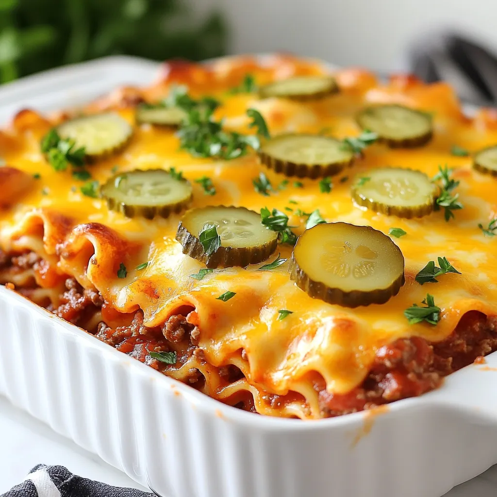A delicious twist on traditional lasagna, combining the flavors of a cheeseburger with layers of pasta and cheese.