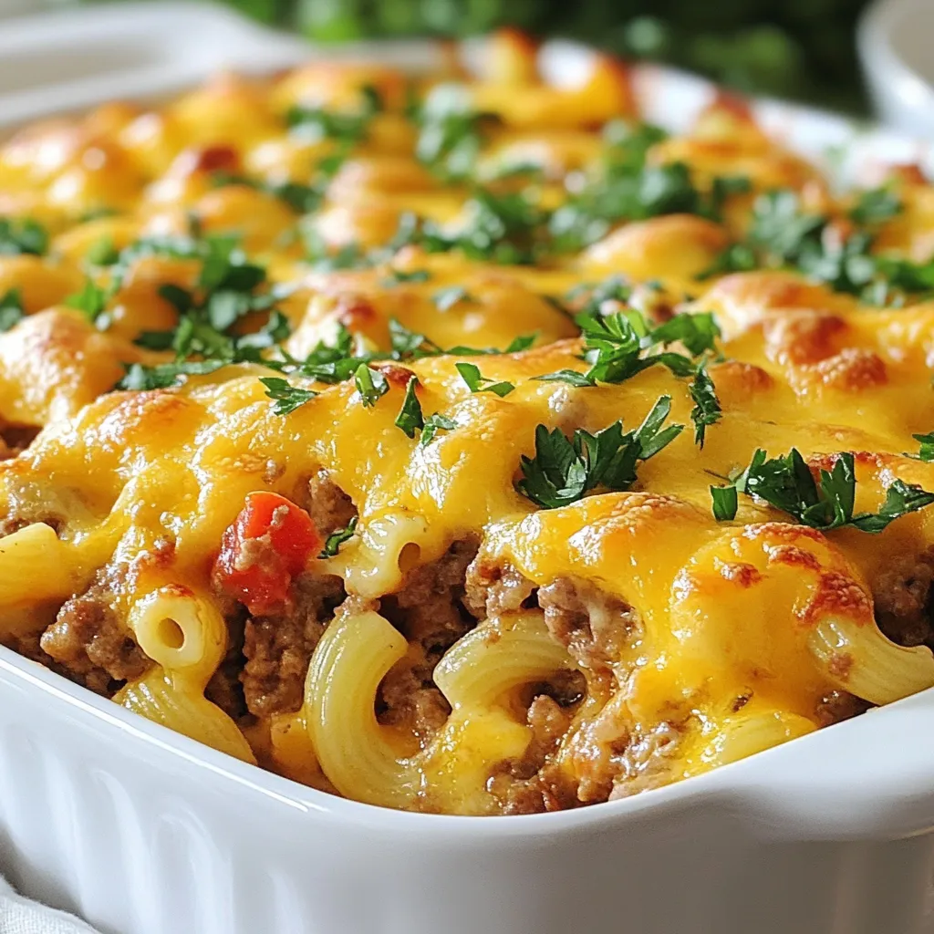 - 1 lb ground beef - 1 medium onion, chopped - 2 cloves garlic, minced - 1 can (15 oz) diced tomatoes with green chilies - 1 cup uncooked elbow macaroni - 2 cups beef broth - 1 teaspoon Italian seasoning - 1 cup shredded cheddar cheese - 1 cup shredded mozzarella cheese - Salt and pepper to taste - Fresh parsley, chopped (for garnish) When you cook, it helps to know the right amounts. Here’s a quick guide: - 1 lb ground beef is about 16 ounces. - 1 medium onion is roughly 1 cup when chopped. - 2 cloves garlic should be minced fine. - 1 can of diced tomatoes holds 15 ounces, perfect for flavor. - 1 cup elbow macaroni is dry and will cook up nicely. - 2 cups beef broth keeps everything moist and tasty. - 1 teaspoon Italian seasoning adds a nice touch. - 1 cup of each cheese gives that cheesy goodness. Using fresh ingredients can enhance the taste. Fresh onions and garlic pack more flavor than dried or powdered forms. I love using fresh parsley for garnish. It adds a pop of color and taste. Canned tomatoes save time and still taste great. The green chilies add a nice kick without being too spicy. For the macaroni, I always choose uncooked. It cooks perfectly in the casserole and absorbs flavors well. {{ingredient_image_1}} First, you need to preheat your oven to 375°F (190°C). This makes sure your casserole bakes evenly. Grab a large skillet and a 9x13 inch baking dish. Grease the baking dish with a little oil. This helps the casserole come out easily. Next, place the skillet on medium heat. Add 1 pound of ground beef to the skillet. Use a wooden spoon to break it apart. Cook until it’s brown. This should take about 5-7 minutes. Drain any extra fat, then add 1 chopped onion and 2 minced garlic cloves. Stir and cook until the onion turns soft. This takes about 3-4 minutes. Now, it’s time to mix in the main ingredients. Add 1 can of diced tomatoes with green chilies, 1 cup of uncooked elbow macaroni, and 2 cups of beef broth. Don’t forget the Italian seasoning, salt, and pepper for flavor. Stir everything well and bring it to a gentle boil. Lower the heat and cover the skillet. Let it simmer for 10-12 minutes until the macaroni is tender. After simmering, take the skillet off the heat. Stir in half of the cheddar cheese and half of the mozzarella cheese. Mix until it’s well combined. Now, carefully pour this mixture into the greased baking dish. Make sure it’s spread out evenly. Finally, sprinkle the remaining cheddar and mozzarella cheese on top. Place the dish in the preheated oven. Bake for 20-25 minutes. Keep an eye on it until the cheese is bubbly and golden. Once done, take it out and let it cool for 5 minutes before serving. You can garnish with fresh chopped parsley for a nice touch. Enjoy your cheesy hamburger casserole bake! To boost flavor, use Italian seasoning. It adds herbs like oregano and basil. You can also add a dash of paprika for warmth. If you like spice, try some cayenne pepper. These spices blend well with the beef and tomatoes. To cook evenly, make sure to break apart the ground beef. Brown it well before adding other ingredients. Stir the mixture often while it simmers. This helps the macaroni cook evenly. If you notice any clumps, break them up gently. For the best cheese melt, use a mix of cheddar and mozzarella. Shred the cheese yourself for better melting. Pre-shredded cheese has additives that can affect melting. Spread cheese evenly across the top before baking. This ensures a nice, golden layer. Pro Tips Brown the Beef Properly: Make sure to brown the ground beef well for enhanced flavor. This caramelization adds depth to your casserole. Use Quality Cheese: Opt for a high-quality sharp cheddar and fresh mozzarella for a richer taste and better melting texture. Add Veggies: Consider adding extra vegetables like bell peppers or zucchini for added nutrition and flavor. Let it Rest: Allow the casserole to cool for a few minutes before serving. This helps the layers set and makes for easier serving. {{image_2}} You can change the meat in this dish. Try ground turkey or chicken instead of beef. You might also use cooked sausage for a spicy kick. If you want a different pasta, use penne or rotini. They work well in casseroles too. Just remember, the cooking time might change a bit. To make a vegetarian version, skip the meat. Use a mix of beans for protein, like black beans or kidney beans. You can add more veggies too, like bell peppers or zucchini. Use vegetable broth instead of beef broth. This keeps the flavor rich. Serve this casserole with a fresh green salad. A light vinaigrette complements the cheesy dish. You can also add garlic bread on the side. It will soak up any extra sauce. For a fun twist, top with sliced jalapeños for heat. Enjoy your meal with a cold drink, like iced tea or lemonade. To keep your Cheesy Hamburger Casserole Bake fresh, let it cool first. Use an airtight container for storage. This helps prevent moisture loss and keeps flavors intact. Store it in the fridge for up to three days. If you want to save it longer, freezing is a great option. To freeze the casserole, let it cool completely. Then, cut it into portions for easy serving. Wrap each piece tightly in plastic wrap. Place the wrapped portions in a freezer-safe bag. This keeps the casserole fresh for up to three months. Label the bag with the date to track freshness. When you're ready to enjoy the leftovers, take a portion from the fridge or freezer. If frozen, let it thaw overnight in the fridge. To reheat, place it in an oven-safe dish. Cover it with foil to keep it moist. Heat at 350°F (175°C) for about 20-25 minutes. For a bubbly finish, uncover for the last 5 minutes. Enjoy your cheesy delight! Yes, you can make this dish ahead of time. Prepare the casserole up to the baking step. Cover it and store it in the fridge. When ready to serve, just bake it. This makes it a great choice for busy days. If you want to switch things up, use other pasta types. You can try 