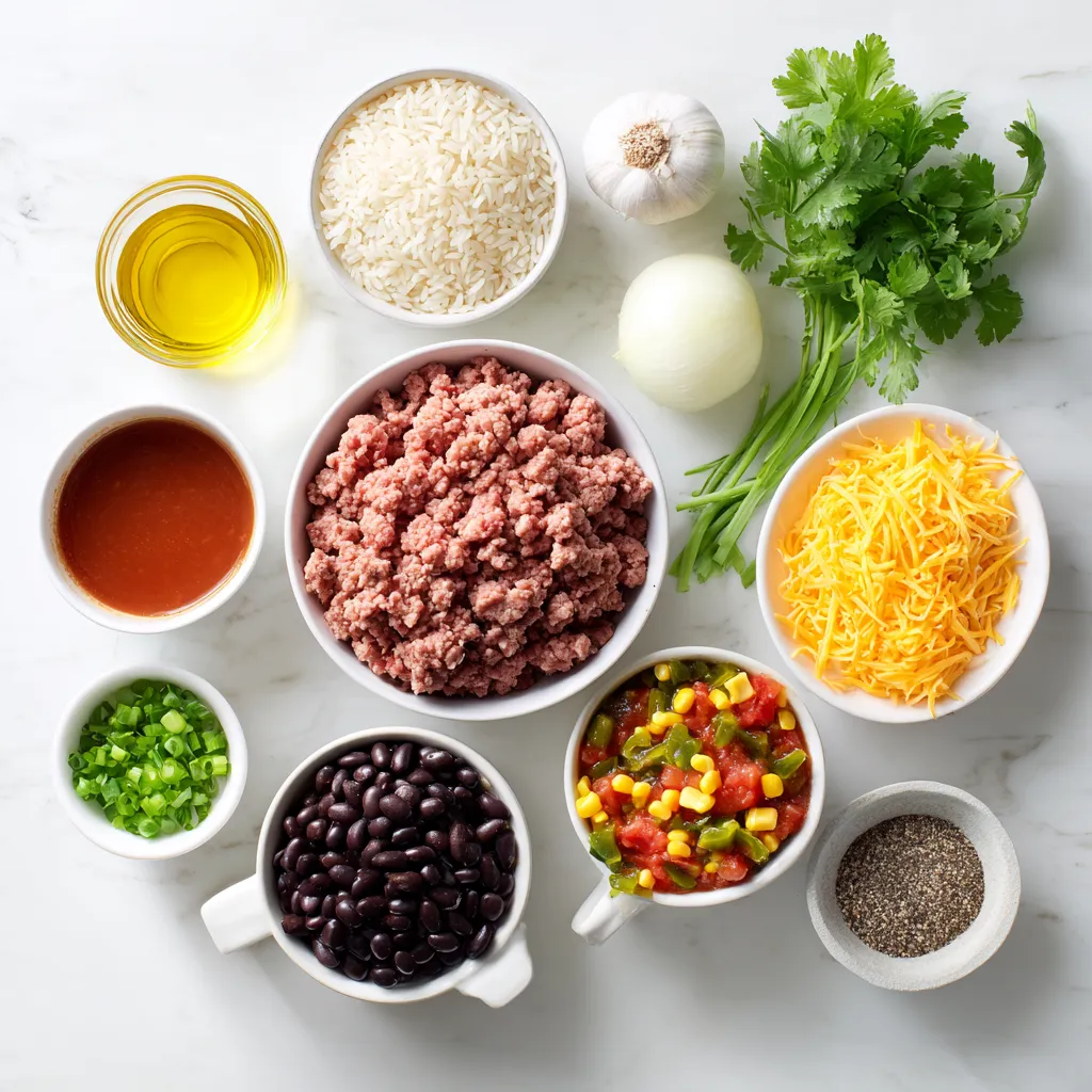 A delicious one-pan meal featuring rice, ground meat, and cheesy goodness.