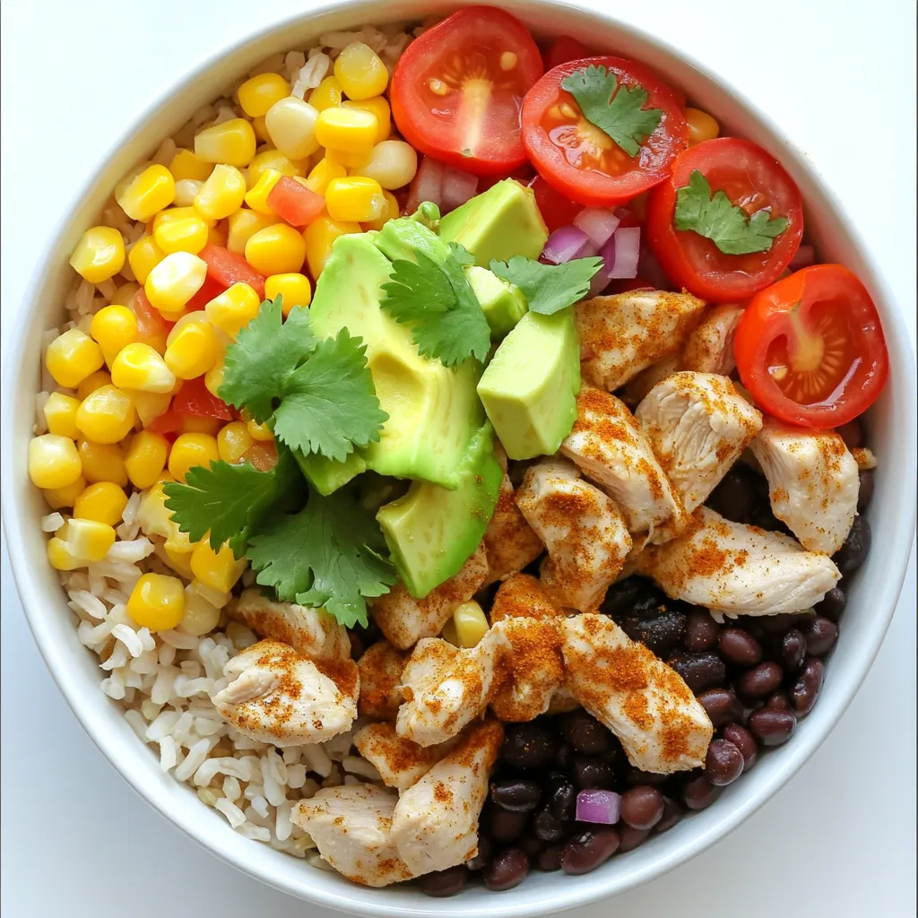 The Chicken Burrito Bowl comes together with simple yet tasty ingredients. You need chicken, brown rice, and some colorful veggies to make this dish shine.