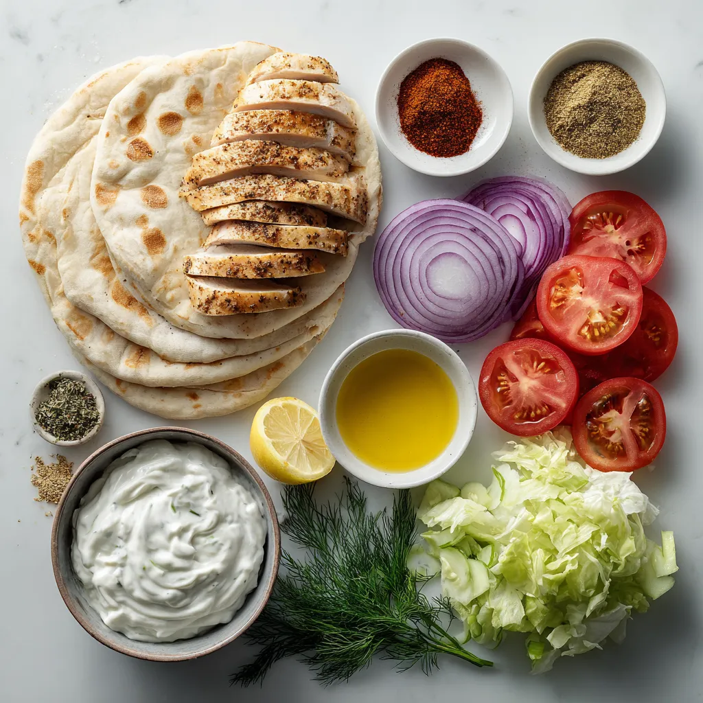 These ingredients build the foundation of flavor for your gyros. The chicken gets juicy and savory from the olive oil and spices. Using fresh toppings like tomato, onion, and lettuce adds crunch and freshness.