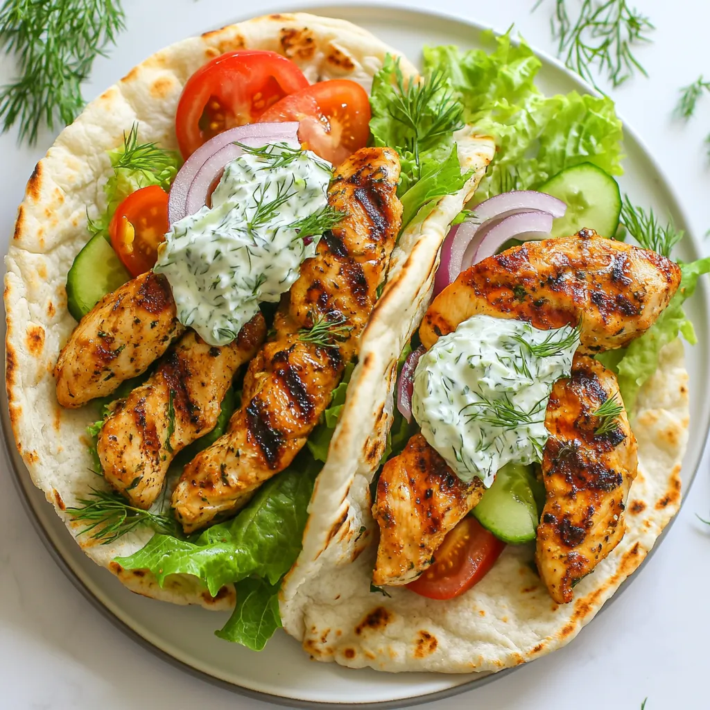 To assemble, take a warm pita bread, layer some fresh lettuce or arugula, and top with cooked chicken strips, sliced tomatoes, and red onions. Drizzle with tzatziki sauce generously over the top.