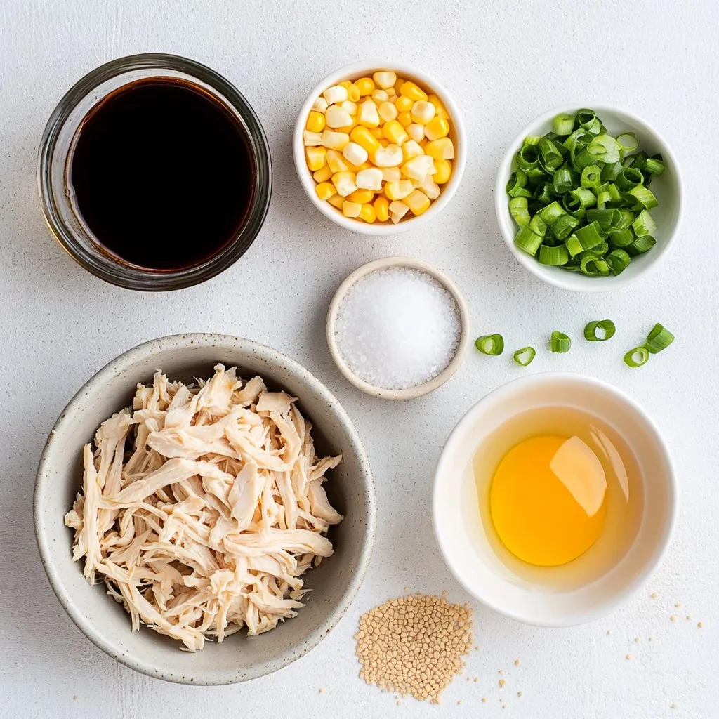 To make Chinese Chicken & Corn Soup, you need simple, fresh ingredients. The heart of this soup is the cooked chicken and corn. I love using shredded chicken because it mixes well and adds a nice texture. Corn gives a sweet taste that brightens the soup.