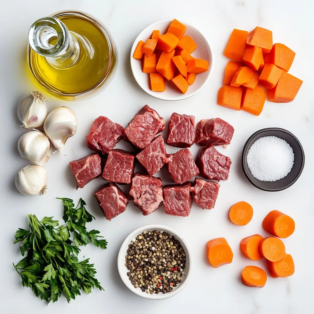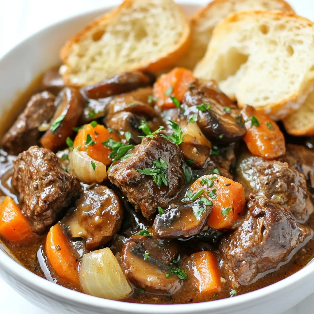 - 2 pounds beef chuck - 4 slices of thick-cut bacon - 1 large onion and 2 carrots - 8 ounces cremini mushrooms To make a great Beef Bourguignon, you need good meat. I use beef chuck. It has the right mix of fat and flavor. Cut the beef into 1-inch cubes. This helps it cook evenly. Bacon adds a lovely smoky taste. Chop four slices into small pieces. If you don't want pork, you can skip this step. For the veggies, I like one large onion and two carrots. Chop the onion and slice the carrots. This adds sweetness and depth to the dish. Mushrooms give a nice earthy flavor. Use eight ounces of cremini mushrooms. Quarter them so they blend well into the stew. - Olive oil and all-purpose flour - Beef broth and tomato paste - Dried thyme and bay leaves You need some basic items from your pantry. Start with two tablespoons of olive oil. It helps to brown the beef and bacon. All-purpose flour is also key. You only need one tablespoon, but it thickens the sauce. For the broth, use beef broth. It adds richness. You need two cups. One tablespoon of tomato paste adds a bit of tang. For herbs, dried thyme and bay leaves are essential. They bring out the flavors in the meat and veggies. - Salt and freshly ground black pepper - Fresh parsley for garnish Lastly, don't forget seasoning. Use salt and freshly ground black pepper. These make the dish pop with flavor. For garnish, I love fresh parsley. Chop it finely and sprinkle it on top before serving. It adds color and freshness to the dish. {{ingredient_image_1}} To make beef bourguignon, you start with the beef. I use 2 pounds of beef chuck. Cut it into 1-inch cubes. This size helps the beef cook evenly and become tender. Next, chop the onion and slice the carrots. I usually use one large onion and two carrots. Having these ready makes cooking easier. If you choose to use bacon, chop four slices of thick-cut bacon. Cook it in your pot until crispy. Use medium heat to avoid burning. Once it’s done, set it aside. If you’re not using bacon, move to the next step. Now, heat 2 tablespoons of olive oil in your pot over medium-high heat. Season the beef cubes with salt and black pepper. Sear the beef in batches. Brown it on all sides. This step adds great flavor. Once browned, remove the beef and set it aside. In the same pot, add your chopped onion and sliced carrots. Cook them for about 5 to 6 minutes. They should be soft. After that, add 2 minced garlic cloves and cook for one more minute. You want to smell that garlic! Next, stir in 1 tablespoon of tomato paste and 1 tablespoon of all-purpose flour. Mix them well. Then gradually add 2 cups of beef broth. Scrape up any browned bits from the bottom of the pot. This adds more flavor! Return the seared beef to the pot. Add 1 teaspoon of dried thyme and 2 bay leaves. If you cooked bacon, add it back now. Bring everything to a simmer. Cover the pot and let it cook on low heat for 1.5 to 2 hours. This ensures the beef gets tender. In the last 20 minutes, add 8 ounces of quartered cremini mushrooms. Stir them in and let them cook. When it's done, taste your dish. Adjust the seasoning with more salt and pepper if needed. Remember to remove the bay leaves before serving. Enjoy your beef bourguignon in deep bowls, garnished with fresh parsley! To get the best taste, start with browning your beef. This step adds deep flavor. When you sear the meat, it creates a tasty crust. Remember to deglaze the pot after browning. Add some broth and scrape up the bits stuck to the bottom. These bits pack a punch of flavor. For a traditional touch, use a good red wine like Pinot Noir. It enhances the dish and adds richness. A heavy pot or a Dutch oven works best for stewing. It holds heat well and cooks evenly. If you don’t have one, a slow cooker can be a great choice. Just set it to low and let it work its magic over a few hours. Both methods create tender beef and rich broth. For the perfect beef bourguignon, simmer for 1.5 to 2 hours. This gives the beef ample time to become tender. Keep the temperature low and steady. If the pot bubbles too much, it can toughen the meat. To check for doneness, poke a piece of beef with a fork. It should be very tender and fall apart easily. Adjust the seasoning before serving, and enjoy this classic dish! Pro Tips Choose the Right Cut: For the best flavor and tenderness, use beef chuck, which becomes melt-in-your-mouth tender when slow-cooked. Let it Rest: After cooking, allow the beef bourguignon to rest for a few minutes; this helps the flavors meld and enhances the overall taste. Adjust Consistency: If the sauce is too thin, mix a little cornstarch with cold water and stir it in to thicken the sauce during the last 10 minutes of cooking. Enhance with Wine: For a richer flavor, substitute half of the beef broth with a good-quality red wine, typically a Burgundy or Pinot Noir. {{image_2}} You can make some tasty swaps in Beef Bourguignon. Instead of beef, use mushrooms or lentils. Both options give a rich flavor and keep the dish hearty. They are also great for vegetarian meals. For broth, choose low-sodium options. This helps cut down on salt without losing taste. To boost flavor, add a splash of red wine. It adds depth and richness. You can also try different herbs like rosemary or oregano. For a spicy kick, mix in some crushed red pepper flakes. This twist can take your Bourguignon to a whole new level! Serve your Beef Bourguignon with classic French sides. Mashed potatoes or buttered noodles work well. You can also pair it with a fresh green salad. Don’t forget crusty bread! It’s perfect for soaking up the delicious sauce. To keep your Beef Bourguignon fresh, use airtight containers. Glass or plastic containers work well. Make sure to let the dish cool before sealing. This helps prevent moisture build-up. For refrigerating, keep the dish in the fridge for up to three days. If you want to store it longer, freezing is your best option. Portion out the stew to make thawing easy. To reh