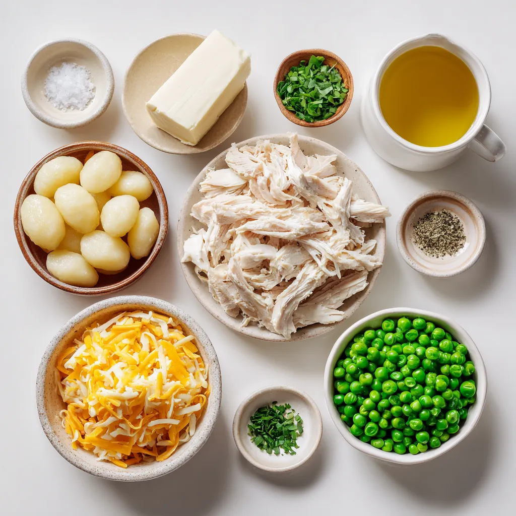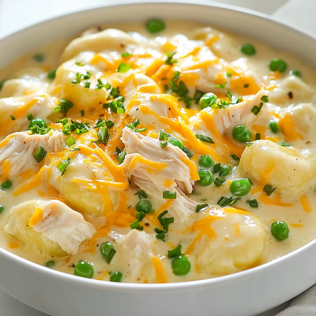 To make Classic Crack Chicken Gnocchi, you need a few key items: - 1 lb (450g) chicken breasts, cooked and shredded - 16 oz (450g) potato gnocchi - 8 oz (225g) cream cheese, softened - 1 packet (1oz) ranch seasoning mix - 1 cup (240ml) chicken broth - 1 cup (240ml) shredded cheddar cheese - 1 cup (150g) frozen peas - 2 tablespoons olive oil - 1/2 teaspoon garlic powder - Salt and pepper to taste - Fresh chives, chopped (for garnish) These ingredients work together to create a creamy, rich dish that is full of flavor. You can easily customize your Crack Chicken Gnocchi by adding more ingredients: - Cooked bacon bits for a smoky touch - Fresh spinach for added greens - Mushrooms for an earthy flavor - Sweet corn for a hint of sweetness These add-ins can enhance the dish and make it your own. For the best flavor, consider these seasonings: - Extra garlic powder for a stronger garlic taste - Dried herbs like thyme or oregano for depth - A pinch of red pepper flakes for heat These seasonings can elevate the dish, making it even more delicious. Try them out to find your favorite combination! {{ingredient_image_1}} Start by filling a large pot with water. Add salt to the water and bring it to a boil. Once boiling, add the potato gnocchi. Cook them based on package directions. You know they are ready when they float to the top. This means they are light and fluffy. Drain the gnocchi and place them aside for now. Next, grab a large skillet and add olive oil. Heat it over medium heat. Add the cooked and shredded chicken to the skillet. Sprinkle in the garlic powder and ranch seasoning mix. Stir everything together. Cook this mix for about 2-3 minutes. This helps the flavors blend well. Lower the heat to medium-low. Now, pour in the chicken broth and add the softened cream cheese. Keep stirring until the cream cheese melts and the sauce is smooth. Once the sauce is creamy, mix in the shredded cheddar cheese. Stir until the cheese melts completely. Now, carefully fold in the cooked gnocchi and frozen peas. Stir gently so everything combines well. Cook for an extra 3-5 minutes until it’s all hot and the peas are tender. Season with salt and pepper to your taste. Finally, remove from heat and sprinkle fresh chives on top. This adds a nice touch before you serve! To cook gnocchi just right, start with salted water. Bring it to a boil and watch for the gnocchi to float. This means they are done! Use a slotted spoon to remove them. If you want, toss them in a bit of olive oil to keep them from sticking. For a creamy sauce, use softened cream cheese. Add it to the skillet with the chicken broth. Stir slowly until the cheese melts completely. This will give you a smooth and rich sauce. If it seems too thick, add a splash more chicken broth. This keeps your sauce silky and light. Serve your Crack Chicken Gnocchi in a large bowl. Top it with extra cheddar cheese for a tasty touch. Add chopped chives for color and freshness. A side of crusty bread pairs well too. It’s perfect for dipping into the creamy goodness. Pro Tips Use Rotisserie Chicken: For a quicker preparation, consider using rotisserie chicken. It adds flavor and saves you cooking time! Customize Your Cheese: Feel free to experiment with different types of cheese! Pepper jack or mozzarella can add a unique twist to the dish. Fresh Herbs Matter: Adding fresh herbs like parsley or basil in addition to chives can elevate the dish and enhance the flavors. Make it a One-Pot Meal: To simplify cleanup, you can cook the gnocchi directly in the same pot as the sauce after adding the chicken broth! {{image_2}} You can easily make a vegetarian version of this dish. Start by swapping the chicken for a mix of colorful vegetables. I love using bell peppers, zucchini, and spinach. Cook the veggies in olive oil with garlic. Then, follow the same steps to create the sauce using cream cheese and broth. This way, you keep the creamy goodness while making it meat-free. If you like some heat, add spices to kick up the flavor. Try mixing in some diced jalapeños or crushed red pepper flakes. You can also add cooked sausage for extra flavor. Just sauté the sausage before adding the chicken or veggies. This spicy twist makes the dish exciting and fun! For a dairy-free option, replace cream cheese and cheddar with cashew cream or almond-based cheese. You can blend soaked cashews with some broth until smooth. Use this to create that creamy texture without dairy. Make sure to taste and adjust your seasonings, as dairy-free cheeses may vary in flavor. This keeps the dish rich and satisfying while being kind to those with dairy allergies. After you make Classic Crack Chicken Gnocchi, let it cool down. Store it in an airtight container. It stays fresh in the fridge for about 3 to 4 days. Make sure to label the container with the date. This way, you know when to eat it. You can freeze this dish too! Pack it in a freezer-safe container. It keeps well for up to 3 months. When you want to enjoy it again, thaw it in the fridge overnight. This helps keep the flavors intact and the texture nice. When you are ready to eat, reheat it gently. You can use the microwave or a stovetop. If using the microwave, warm it in short bursts. Stir in between to heat evenly. If on the stove, add a splash of chicken broth to keep it creamy. Heat until hot, but avoid boiling to keep the gnocchi from getting mushy. Enjoy your meal! Crack Chicken Gnocchi is a creamy, savory dish. It combines shredded chicken, potato gnocchi, and ranch flavors. The ranch seasoning gives it a unique taste that many love. The dish also has cheese and peas, adding richness and color. Yes, you can use fresh gnocchi instead of potato gnocchi. Fresh gnocchi cooks faster, so watch it closely. Boil it until it floats, just like the potato version. This switch can add a nice texture to your meal. To make this dish ahead, cook the gnocchi and chicken mixture separately. Store them in airtight containers. When ready to eat, he