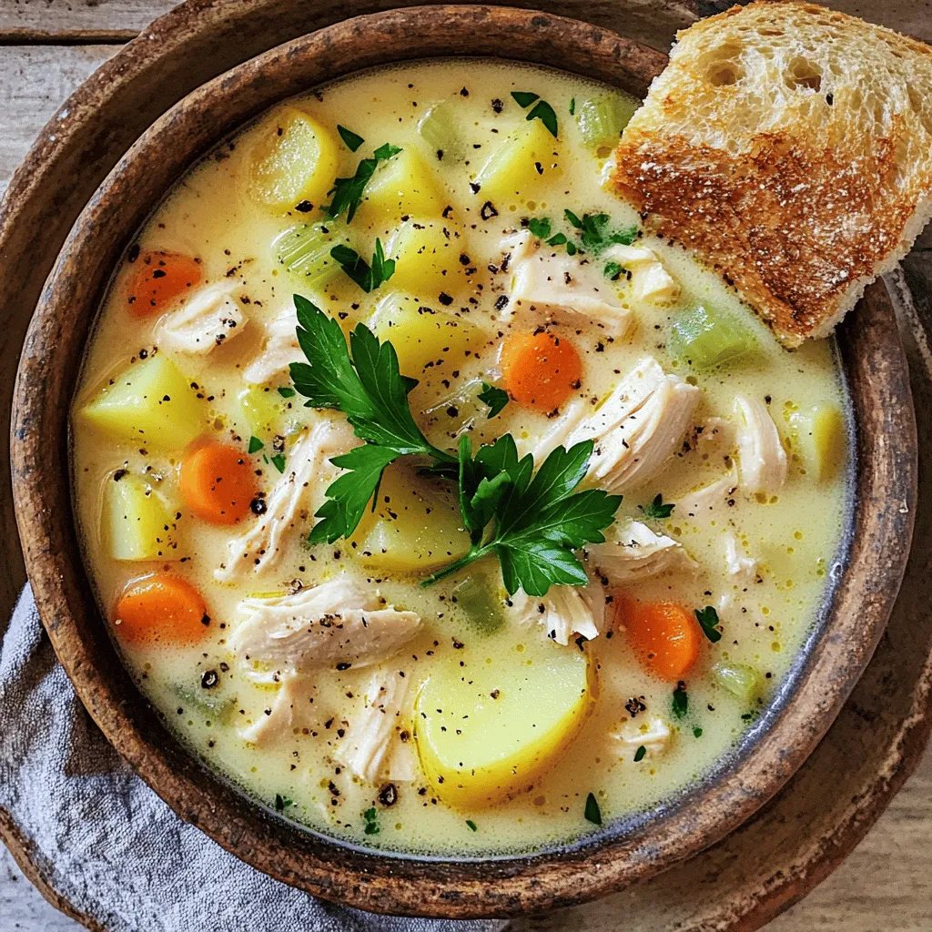 To make Cozy Chicken Potato Soup, you need simple yet fresh ingredients. Here is what you'll need: - 2 boneless, skinless chicken breasts, diced - 4 medium potatoes, peeled and diced - 1 cup carrots, diced - 1 cup celery, diced - 1 medium onion, chopped - 4 cloves garlic, minced - 6 cups chicken broth - 1 cup heavy cream - 2 tablespoons olive oil These ingredients come together to create a warm and hearty soup. The chicken adds protein, while potatoes and veggies give it body. Seasoning makes or breaks the soup. Here are the key flavor boosters: - 1 teaspoon dried thyme - 1 teaspoon smoked paprika - Salt and pepper to taste Thyme adds a nice earthiness, while smoked paprika gives a hint of warmth. Adjust salt and pepper to your liking. Adding these spices enhances the soup's flavor profile. Garnishes elevate the presentation and taste. I recommend: - Fresh parsley, chopped Sprinkling freshly chopped parsley on top adds color and freshness. It makes the soup look inviting and adds a burst of flavor with each bite. Pair your soup with crusty bread for dipping. Start by gathering your ingredients. You will need: - 2 boneless, skinless chicken breasts, diced - 4 medium potatoes, peeled and diced - 1 cup carrots, diced - 1 cup celery, diced - 1 medium onion, chopped - 4 cloves garlic, minced - 6 cups chicken broth - 1 cup heavy cream - 2 tablespoons olive oil - 1 teaspoon dried thyme - 1 teaspoon smoked paprika - Salt and pepper to taste - Fresh parsley, chopped (for garnish) Next, chop the onion and garlic. Dicing the chicken, potatoes, carrots, and celery comes next. The smaller the pieces, the faster they cook. Heat olive oil in a large pot over medium heat. Add the chopped onion and garlic. Sauté for about 3-4 minutes until the onion turns translucent. This step builds a strong flavor base. Now, add the diced chicken. Cook it for about 5-6 minutes until it browns on all sides. This gives the chicken a nice texture. After browning, stir in the carrots and celery. Cook for another 3 minutes to soften them. Next, it’s time to pour in the chicken broth. Add the diced potatoes, dried thyme, and smoked paprika. Season with salt and pepper. Bring the mixture to a boil, then reduce heat to simmer. Cover the pot and let it cook for 20-25 minutes until the potatoes are tender. Once the potatoes are cooked, stir in the heavy cream. Let it simmer uncovered for another 5 minutes. This step makes the soup rich and creamy. Check the seasoning and adjust if needed. To achieve the perfect soup, keep a close eye on the simmering time. If the soup seems too thin, let it simmer longer without the lid. This will help thicken it up. If it's too thick, add a little more chicken broth or water. Using the right amount of heavy cream is key. It brings a creamy texture without overpowering the soup. Lastly, garnish with freshly chopped parsley before serving. This adds color and a fresh taste. Enjoy your cozy chicken potato soup! To make your cozy chicken potato soup even tastier, use a few simple techniques. Start by sautéing the onion and garlic in olive oil. This step brings out their sweet flavors. Brown the chicken next. This adds a nice depth to the soup. When you add the broth, scrape the pot's bottom. This helps mix in all those tasty bits stuck on the pot. Having the right tools can make a big difference. Use a large pot to hold all the ingredients. A good knife makes chopping easy. A cutting board keeps your workspace neat. A wooden spoon is great for stirring. If you have an immersion blender, use it to cream the soup for a smooth finish. Lastly, a ladle helps serve the soup without a mess. Feel free to customize the soup to your taste. If you want a thicker soup, mash some of the potatoes before adding the cream. You can also add extra veggies like peas or corn for color and crunch. If you love spice, try adding a pinch of cayenne pepper. For a lighter soup, use half-and-half instead of heavy cream. Always taste as you go and adjust the salt and pepper to your liking. {{image_2}} You can boost the nutrition and flavor of your cozy chicken potato soup by adding extra vegetables. Try these options: - Peas: Add 1 cup of frozen peas for a sweet burst. - Spinach: Stir in 2 cups of fresh spinach at the end for color and vitamins. - Corn: Mix in 1 cup of corn for texture and sweetness. - Bell Peppers: Dice 1 cup of bell peppers for a crunchy bite. These veggies add color and nutrition while keeping the soup hearty and comforting. If you want to mix things up, you can swap chicken for other proteins. Here are some ideas: - Turkey: Use diced turkey breast for a leaner option. - Tofu: For a vegetarian version, add firm tofu cubes. - Beans: Mix in a can of white beans for added protein and fiber. - Pork: Diced pork tenderloin can give a different flavor profile. These alternatives can change the taste. They still keep the soup warm and filling. You can make cozy chicken potato soup lighter without losing flavor. Here are some swaps: - Low-Fat Cream: Use low-fat cream or milk instead of heavy cream. - Broth Options: Choose low-sodium chicken broth to cut down on salt. - Olive Oil: Use just 1 tablespoon of olive oil to reduce fat. - Potato Alternatives: Swap regular potatoes for sweet potatoes for a healthier twist. These changes keep the soup tasty while making it healthier. Enjoy your cozy chicken potato soup with these fun variations! To store leftover Cozy Chicken Potato Soup, let it cool first. Pour the cooled soup into an airtight container. Seal it tightly. Place the container in the fridge. It will stay fresh for about three to four days. Be sure to label the container with the date. This helps you remember when you made it. If you want to keep the soup longer, freezing is a great choice. Use freezer-safe containers or heavy-duty freezer bags. Leave some space in the container for the soup to expand. It’s best to freeze the soup without the cream. Add the cream when you reheat the soup. Properly stored