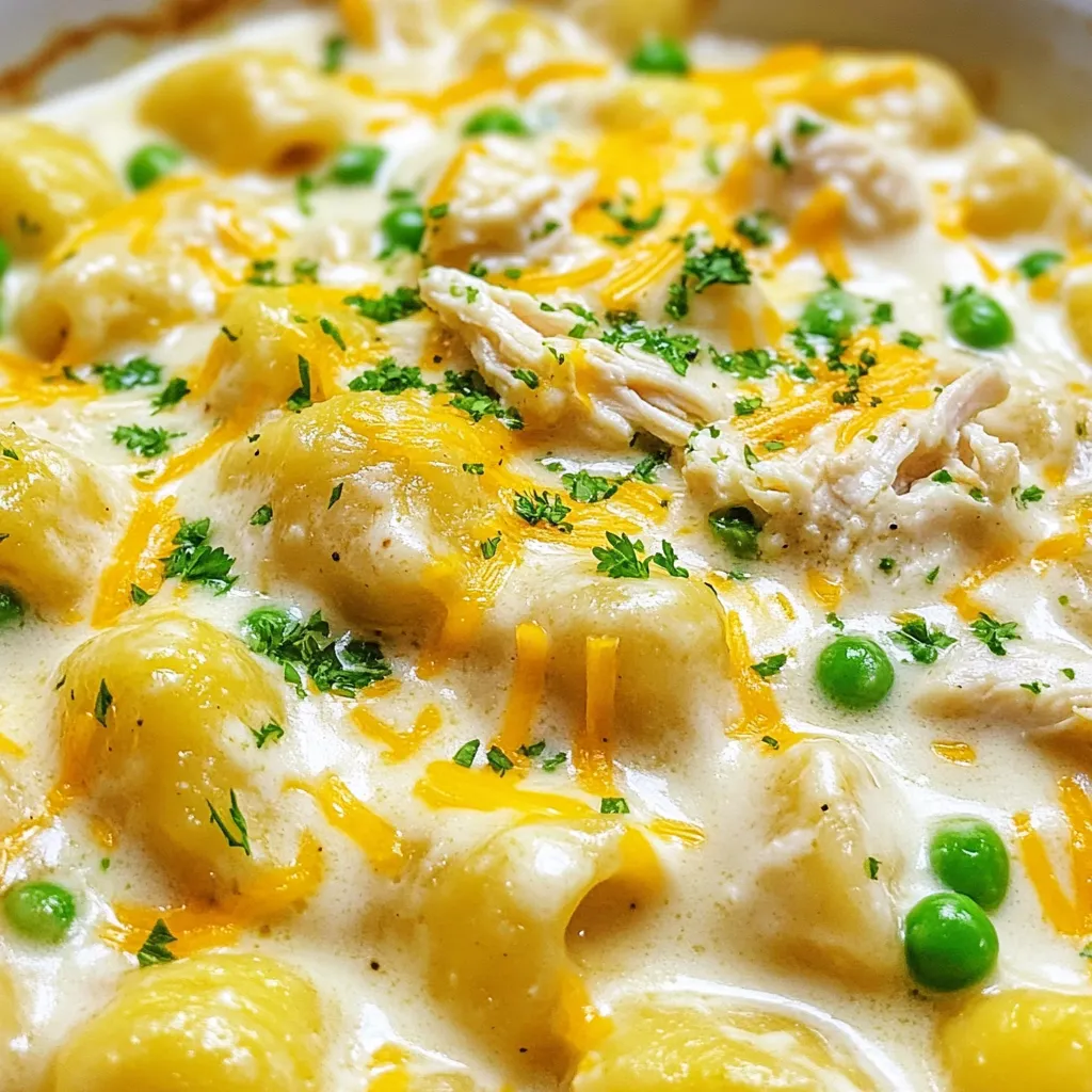 A creamy and delicious gnocchi dish with shredded chicken and cheese.