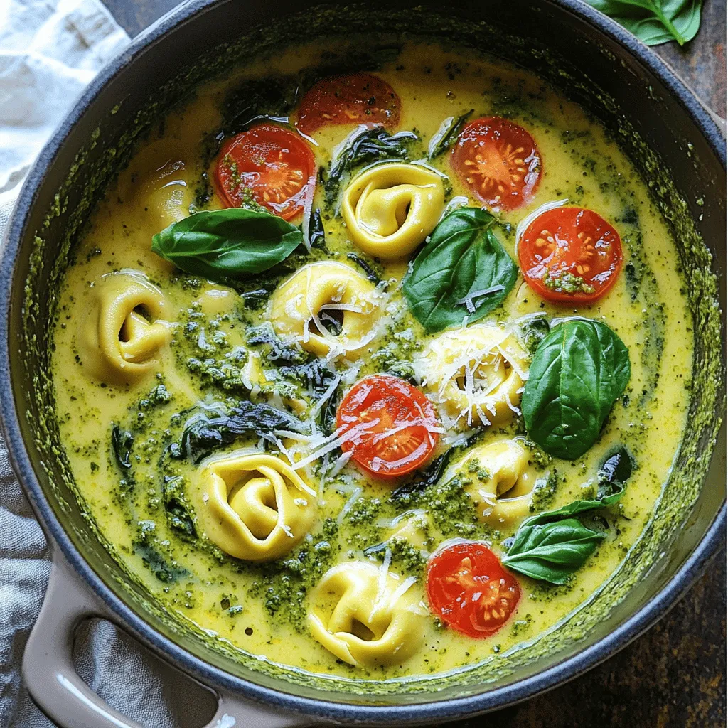 For this creamy pesto tortellini soup, you need a few key items. Here’s what you'll need: - 1 tablespoon olive oil - 1 small onion, diced - 2 cloves garlic, minced - 4 cups vegetable broth - 1 cup heavy cream - 1 cup basil pesto - 1 package (9 oz) cheese tortellini (fresh or frozen) - 1 cup cherry tomatoes, halved - 2 cups fresh spinach - Salt and pepper to taste - Grated Parmesan cheese for serving - Fresh basil leaves for garnish The olive oil helps to sauté the onion and garlic. The onion adds sweetness, while the garlic brings flavor. Vegetable broth gives the soup a rich base. Heavy cream makes it creamy and smooth. Basil pesto adds a fresh, herbaceous taste. Tortellini is the star of the dish, providing a delightful bite. Cherry tomatoes offer sweetness and color. Fresh spinach adds nutrition and a pop of green. Garnishes can elevate your soup. Here are some options to consider: - Grated Parmesan cheese - Fresh basil leaves - Crushed red pepper flakes for heat - A drizzle of olive oil for richness These toppings add flavor and texture. Parmesan gives a salty kick. Fresh basil enhances the herb taste. Red pepper flakes can spice things up. You can easily modify this recipe for different diets. Here are some ideas: - Use coconut milk instead of heavy cream for a dairy-free option. - Swap cheese tortellini for gluten-free tortellini. - For a vegan version, use vegetable broth, coconut milk, and vegan pesto. These changes keep the soup tasty while fitting your needs. Feel free to mix and match based on what you have. Start by heating the olive oil in a large pot over medium heat. Once hot, add the diced onion. Cook it for about 3-4 minutes until it turns soft and clear. This step builds the soup's flavor. Next, add the minced garlic and stir it for 1 minute. Keep an eye on it so it doesn’t burn. The smell will be amazing! Pour in the vegetable broth and bring it to a boil. This will create a rich base for your soup. When it starts boiling, add the heavy cream and basil pesto. Stir them together well. The creamy texture and basil flavor mix perfectly. This is where the magic happens, and your soup starts to look delicious! Now it’s time to add the tortellini. Follow the package instructions for cooking time, usually about 5-7 minutes. When the tortellini is soft, stir in the halved cherry tomatoes and fresh spinach. Cook for another 2-3 minutes until the spinach wilts. This adds color and nutrition to your soup. Lastly, season with salt and pepper to taste. Serve it hot with grated Parmesan cheese and fresh basil on top. Enjoy! To keep your soup nice and creamy, use heavy cream. It blends well with the pesto. You can also add a bit more pesto for extra flavor. If you want a lighter option, try half-and-half instead. Just remember, it may not be as thick. Stir the cream in slowly to prevent curdling. Fresh ingredients make a big difference in flavor. Use fresh spinach instead of frozen for better taste and texture. Look for vibrant cherry tomatoes; they should feel firm and look shiny. When choosing tortellini, go for fresh if you can find it. It cooks faster and tastes better. If your soup is too thick, add more vegetable broth or cream. Stir well and let it heat up. If you find it too salty, add a sliced potato. Let it cook for a few minutes, then remove the potato. It will soak up some salt. For a bland taste, add more pesto or a splash of lemon juice. This will brighten the flavors. {{image_2}} You can switch up your pasta in this soup. Instead of tortellini, try using small shells or bowtie pasta. These shapes hold the creamy broth well. You can also use whole wheat or gluten-free pasta for a healthier option. Just keep an eye on cooking times. Fresh pasta cooks faster than dried pasta. Want to make your soup heartier? Add some protein! Cooked chicken, shrimp, or sausage can fit right in. If you want a vegetarian option, try chickpeas or white beans. Just add them in when the tortellini is cooking. This way, they warm up nicely and blend with the flavors. Spice up your soup with extra flavors. Consider adding a pinch of red pepper flakes for heat. Lemon zest can add a fresh pop. You could also throw in some Italian herbs like oregano or thyme. For a twist, try sun-dried tomatoes or artichoke hearts. These additions can really boost the taste and make your soup unique! After enjoying your creamy pesto tortellini soup, let it cool first. Then, pour it into an airtight container. Make sure it is sealed well to keep out air. You can keep leftovers in the fridge for up to three days. If you want to enjoy it later, freezing is a great option. To reheat, pour the soup into a pot. Heat it on low to medium heat. Stir often to avoid burning. You can also use the microwave. Place the soup in a microwave-safe bowl. Heat it in short bursts, stirring in between. Add a splash of broth or cream if it gets too thick. If you want to freeze the soup, use a freezer-safe container. Leave some space at the top, as the soup will expand when frozen. It can last for up to three months in the freezer. To enjoy it later, thaw it in the fridge overnight before reheating. Yes, you can skip the cream. Use a non-dairy milk like almond or oat milk instead. This will keep the soup creamy without the dairy. If you want, add a little more pesto for extra flavor. You can also blend cashews or silken tofu for creaminess. If you don't have pesto, try using spinach or arugula. Blend them with olive oil, nuts, and garlic for a quick sauce. You can also use sun-dried tomatoes for a nice twist. A mix of herbs like basil and parsley can work too. Just add olive oil to make it smooth. This recipe is almost vegetarian. Just make sure to use vegetable broth instead of chicken broth. The tortellini should also be cheese-filled and not contain meat. This way, you’ll have a tasty vegetarian soup full of flavor. This blog post covered essential ingredients for the soup, step-by-step instructions, and helpful tips. We explo