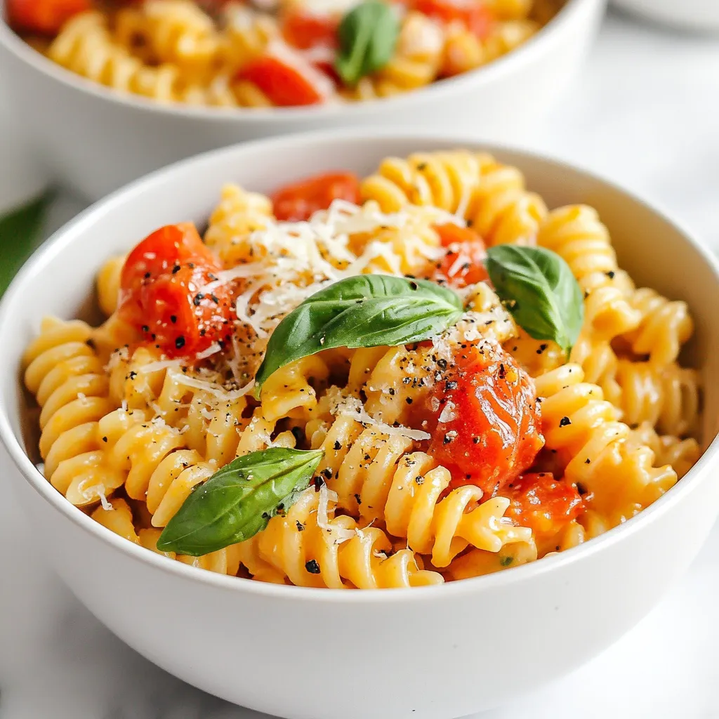- 8 ounces pasta (fusilli or penne work great) - 1 tablespoon olive oil - 3 cloves garlic, minced - 1 can (14 ounces) crushed tomatoes - 1 teaspoon dried oregano - 1 teaspoon sugar (optional) - 1/2 cup heavy cream or coconut cream - 1 teaspoon salt - 1/2 teaspoon black pepper - 1 cup fresh basil leaves, chopped - 1/4 teaspoon red pepper flakes for heat - 1 teaspoon balsamic vinegar for depth - 1/2 cup spinach for added greens - A splash of white wine for flavor - Extra fresh basil leaves - Grated Parmesan cheese - A drizzle of olive oil - Cracked black pepper for a finishing touch {{ingredient_image_1}} To cook the pasta just right, start with a large pot. Fill it with water and add a good amount of salt. Bring the water to a boil. Once boiling, add 8 ounces of your favorite pasta. I like fusilli or penne. Cook the pasta as the package says until it is al dente. This means it should be firm but not hard. Drain the pasta in a colander, but keep 1/2 cup of the pasta water. This water will help later. Now, let’s make the sauce. In a large skillet, pour in 1 tablespoon of olive oil. Heat it over medium heat. Add 3 cloves of minced garlic. Sauté the garlic for about 1-2 minutes. You want it to smell good but not brown. Then, add a 14-ounce can of crushed tomatoes to the skillet. Stir and mix in 1 teaspoon of dried oregano, 1 teaspoon of sugar (if you want), 1 teaspoon of salt, and 1/2 teaspoon of black pepper. Let this simmer for 5-7 minutes. This helps the sauce thicken and develop its flavor. After your sauce thickens, it’s time to add the cream. Lower the heat and pour in 1/2 cup of heavy cream or coconut cream. Stir well until it is all mixed together. Let it simmer for 3-4 minutes. The sauce should be creamy and warm. Now, add the cooked pasta to your skillet with the sauce. Toss everything together, adding some of the reserved pasta water if needed. This helps make the sauce cling to the pasta. Finally, stir in 1 cup of chopped fresh basil. Make sure everything is well-coated. Taste your dish and adjust the seasoning as needed. Enjoy your creamy tomato pasta! To get a smooth and creamy sauce, use heavy cream. You can also use coconut cream for a dairy-free version. Stir the cream in slowly. This helps the sauce blend well. If your sauce is too thick, add a little pasta water. This will thin it out without losing flavor. To boost flavor, add more spices. Try a pinch of red pepper flakes for heat. You can also mix in some fresh herbs like thyme or parsley. A splash of balsamic vinegar adds depth. If your sauce tastes too acidic, add a teaspoon of sugar. This balances the flavors nicely. One common mistake is overcooking the pasta. Always cook it al dente. This keeps the pasta firm and helps it hold the sauce better. Another mistake is adding cream too early. Wait until the sauce simmers before mixing it in. Lastly, don’t forget to taste! Adjust seasoning as needed. This is key for a great dish. Pro Tips Use Fresh Ingredients: Fresh basil and garlic significantly enhance the flavor of your dish. Opt for fresh tomatoes if possible for a more vibrant sauce. Adjust Creaminess: Depending on your preference, you can add more cream for a richer sauce or substitute with vegetable broth for a lighter option. Perfect Pasta Cooking: Make sure to cook the pasta al dente, as it will continue to cook slightly when mixed with the sauce, ensuring it retains a perfect bite. Save Pasta Water: Always reserve some pasta water before draining. This starchy water can help adjust the sauce's consistency and helps it cling better to the pasta. {{image_2}} You can make this creamy tomato pasta dairy-free by using coconut cream. Coconut cream adds a rich texture and a hint of sweetness. It blends well with the tomatoes and basil. To use it, simply replace the heavy cream with an equal amount of coconut cream. This will keep your dish creamy without the dairy. If you want a lighter taste, use light coconut milk instead. It still works great! Adding protein to your creamy tomato pasta makes it heartier. You can use cooked chicken, shrimp, or even plant-based proteins like tofu. For chicken, grill or sauté pieces until cooked through. For shrimp, sauté them in olive oil until pink and tender. Stir your chosen protein into the sauce just before adding the pasta. This way, the flavors meld nicely. You can also add cooked sausage for a spicy kick! Boost the nutrition of your pasta by adding vegetables. Spinach, zucchini, or bell peppers are great choices. Start by sautéing your veggies in the olive oil before adding the garlic. This way, they get tender and soak up the flavors. You can also stir in some peas or broccoli at the end for a pop of color and health. These additions not only enhance the taste but also make your meal more balanced. To store your creamy tomato pasta, let it cool down first. Transfer it to an airtight container. Refrigerate it within two hours of cooking. This keeps it fresh for up to three days. When you’re ready to eat, check for any off smells or changes in texture. Freezing is a great way to save leftover creamy tomato pasta. Place it in a freezer-safe container. Leave some space at the top for expansion. Seal it tightly and label it with the date. It can last up to three months in the freezer. When you’re ready to eat it, thaw it overnight in the fridge. To reheat, use a microwave-safe dish or a skillet. For the microwave, heat in short bursts, stirring in between. This helps it heat evenly. If using a skillet, add a splash of water or broth to keep it moist. Heat over low to medium heat until warmed through. Add fresh basil or cheese for a flavor boost! Yes, you can use any pasta you love. Fusilli and penne work well, but spaghetti, farfalle, or even gluten-free pasta are great choices. Just remember to cook the pasta until al dente. The shape can change the look and feel of your creamy tomato pasta, but the taste stays delicious. This recipe is already vegetarian since it do