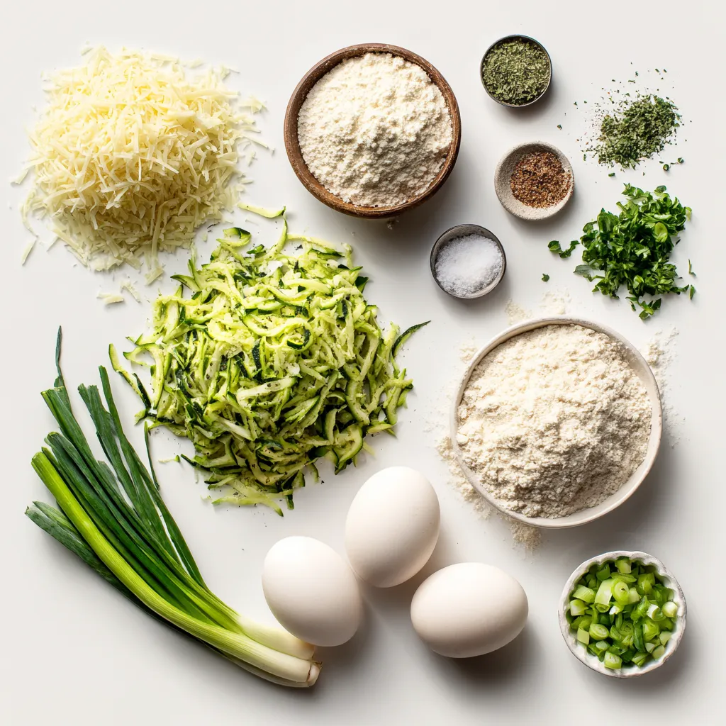 To make these crispy zucchini fritters, you need fresh and simple ingredients. The zucchinis bring a light taste and moisture. The salt helps to pull out that moisture. Flour and eggs bind the mix together. Parmesan adds a savory touch. Fresh parsley brightens the flavor. Garlic and onion powders give a nice kick. Green onions add crunch and color.
