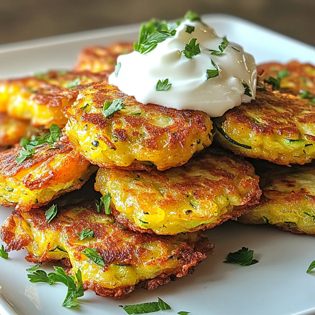 Crispy zucchini fritters are great with dips. I love serving them with sour cream or tzatziki sauce. These dips add a creamy touch and balance the flavors. For garnishing, sprinkle chopped parsley on top. This adds color and a fresh taste. You can also add a squeeze of lemon juice for a zesty kick.