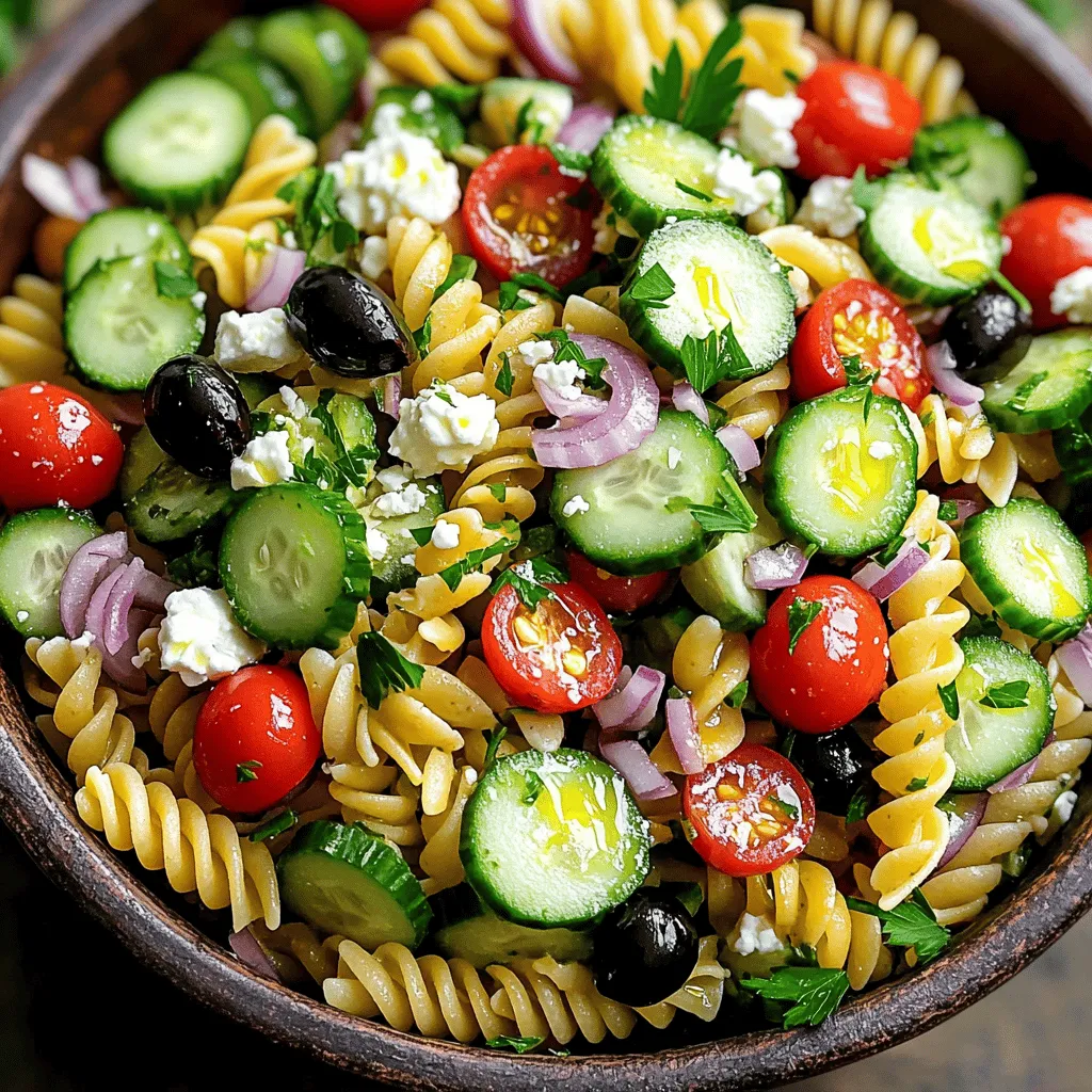 Serve the salad chilled or at room temperature. This dish is great for picnics or barbecues. Garnish with fresh parsley for a pop of color. You can also add more feta on top if you like. Enjoy this fresh and flavorful delight!