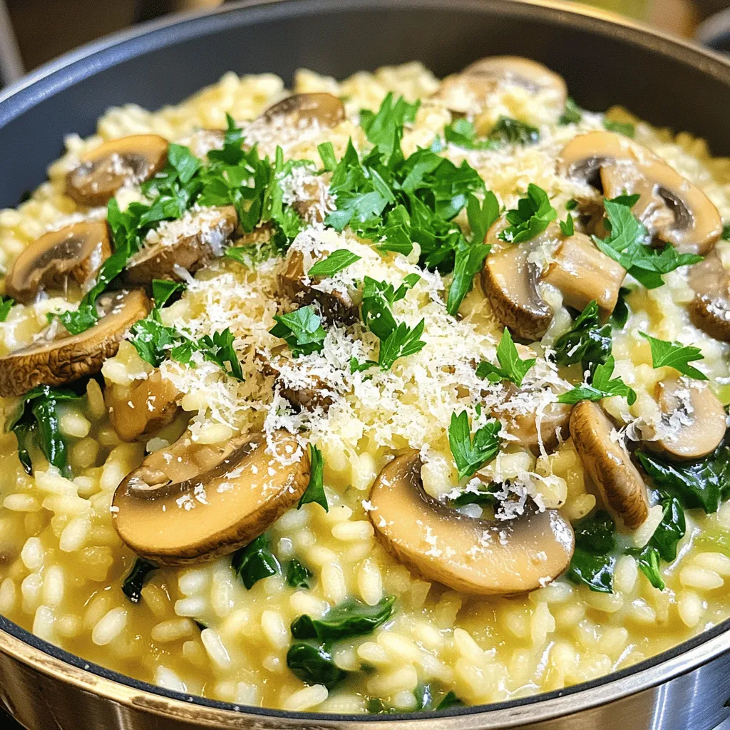 - 1 cup Arborio rice - 4 cups vegetable broth - 1 cup mushrooms (button or cremini), sliced - 1 medium onion, finely chopped - 2 cloves garlic, minced Arborio rice is key for creamy risotto. It has a high starch content that helps thicken the dish. Vegetable broth gives flavor and depth. I like to use homemade broth when I can. Fresh mushrooms add a rich umami taste. You can choose button or cremini mushrooms based on what you prefer. Onion and garlic build a great base for the risotto, making it aromatic and inviting. - 1 cup fresh spinach, roughly chopped - 1/2 cup grated Parmesan cheese - 2 tablespoons olive oil - 1 tablespoon unsalted butter - Salt and pepper to taste - Fresh parsley, chopped (for garnish) Adding fresh spinach gives a nice color and a boost of nutrients. Parmesan cheese adds a creamy richness and salty flavor. Olive oil and butter work together for a savory base. Seasoning with salt and pepper is key to enhancing the taste. Finally, fresh parsley adds a bright touch when you serve your risotto. First, I heat olive oil and butter in a large pot over medium heat. I add the finely chopped onion and minced garlic. I sauté them until the onion turns clear, which takes about 3 to 4 minutes. This step builds a great flavor base for the risotto. Next, I stir in the sliced mushrooms. I cook them until they are tender and golden brown. This usually takes around 5 to 7 minutes. The mushrooms soak up the goodness from the onion and garlic. After the mushrooms are ready, I add 1 cup of Arborio rice to the pot. I stir well to coat each grain with the oil and butter mix for about 2 minutes. This helps the rice cook evenly. Then, I gradually add vegetable broth, one cup at a time. I stir constantly until the liquid is mostly gone before adding more broth. This step takes about 20 minutes. It is important to keep stirring to get that creamy texture risotto is known for. When the rice is creamy and al dente, I stir in 1 cup of fresh spinach. The spinach wilts quickly, adding color and nutrition. Next, I remove the pot from heat and mix in 1/2 cup of grated Parmesan cheese. I season the risotto with salt and pepper to taste. This brings all the flavors together in a simple and delicious way. I serve the risotto warm, garnished with chopped fresh parsley for a pop of color. Enjoy! To get that perfect creamy risotto, you must stir often. Stirring helps release starch from the rice. This starch makes the dish rich and smooth. If you stop stirring, your risotto may become grainy. The broth's temperature is also key. Use warm broth for the best texture. Cold broth can shock the rice. This can slow down cooking and ruin creaminess. Add herbs to boost the flavor. Fresh thyme or rosemary pairs well with mushrooms. You can also try basil for a twist. If you want to switch up the cheese, try goat cheese or feta. Both add a nice tang to the dish. Pre-soaking the rice can cut down on cooking time. Soak it for about 30 minutes before cooking. This helps the rice absorb liquid faster. Using a pressure cooker is another great option. It cooks risotto in a fraction of the time. Just follow your cooker’s guidelines for rice and broth ratios. {{image_2}} You can add protein to your risotto to make it heartier. - Chicken: Cook diced chicken breast until golden, then stir it in at the end. - Seafood: Shrimp or scallops work well. Sauté them briefly before adding to the risotto. - Vegetarian Options: Consider chickpeas or lentils for a protein boost. They add texture and flavor. Feel free to swap in different veggies based on what you have. - Seasonal Vegetables: Try peas in spring or butternut squash in fall. They change the taste and color. - Mushroom Varieties: Use shiitake, portobello, or even wild mushrooms for a unique twist. Each type brings its own flavor. You can easily adjust this risotto to fit different diets. - Gluten-Free: This recipe is already gluten-free since Arborio rice is safe. Just check your broth. - Vegan Options: Replace Parmesan with nutritional yeast for a cheesy flavor without dairy. Use vegan butter and broth for a full vegan dish. These variations let you make the risotto your own. Experiment with different proteins and veggies to find your favorite mix! To store leftover risotto, let it cool first. Place it in a shallow dish. This helps it cool faster. Cover the dish with plastic wrap or a lid. Store it in the fridge for up to three days. For storage containers, use airtight glass or plastic containers. These keep your risotto fresh and tasty. The best methods for reheating risotto are on the stove or in the microwave. For the stove, add a splash of broth or water. Heat it gently over low heat, stirring often. This keeps it creamy. In the microwave, place the risotto in a safe bowl. Add a little broth or water. Cover the bowl with a damp paper towel. Microwave in short bursts, stirring in between. This helps avoid mushiness. Yes, you can freeze risotto! First, let it cool completely. Then, scoop it into freezer bags or airtight containers. Remove as much air as possible. Label the bags with the date. It keeps well for about three months. For thawing, place the frozen risotto in the fridge overnight. To reheat, use the stove or microwave with a splash of broth or water. This keeps the texture nice and creamy. You can make risotto without constant stirring by using a technique called the “oven method.” Start by sautéing your onions and garlic in a pot. Then, add the Arborio rice and broth. Instead of stirring, cover the pot and place it in the oven at 375°F (190°C). Bake for about 20-25 minutes. This allows the rice to absorb the liquid evenly without the need for constant attention. You will still get creamy results. Yes, you can prepare risotto in advance! Cook the risotto as usual but stop just before it reaches the creamy stage. Allow it to cool completely, then store it in the fridge in an airtight container. When you are ready to serve, reheat it in a pot over 