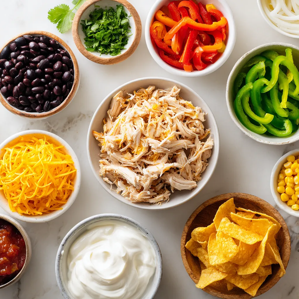 Each ingredient plays a special role. The chicken adds protein, and the bell peppers and onion give sweetness and crunch. Black beans and corn add fiber and texture. Fajita seasoning brings a bold flavor, while salsa adds moisture and zest. The cheese and sour cream make it creamy and rich. Finally, the crushed tortilla chips give a nice crunch on top.