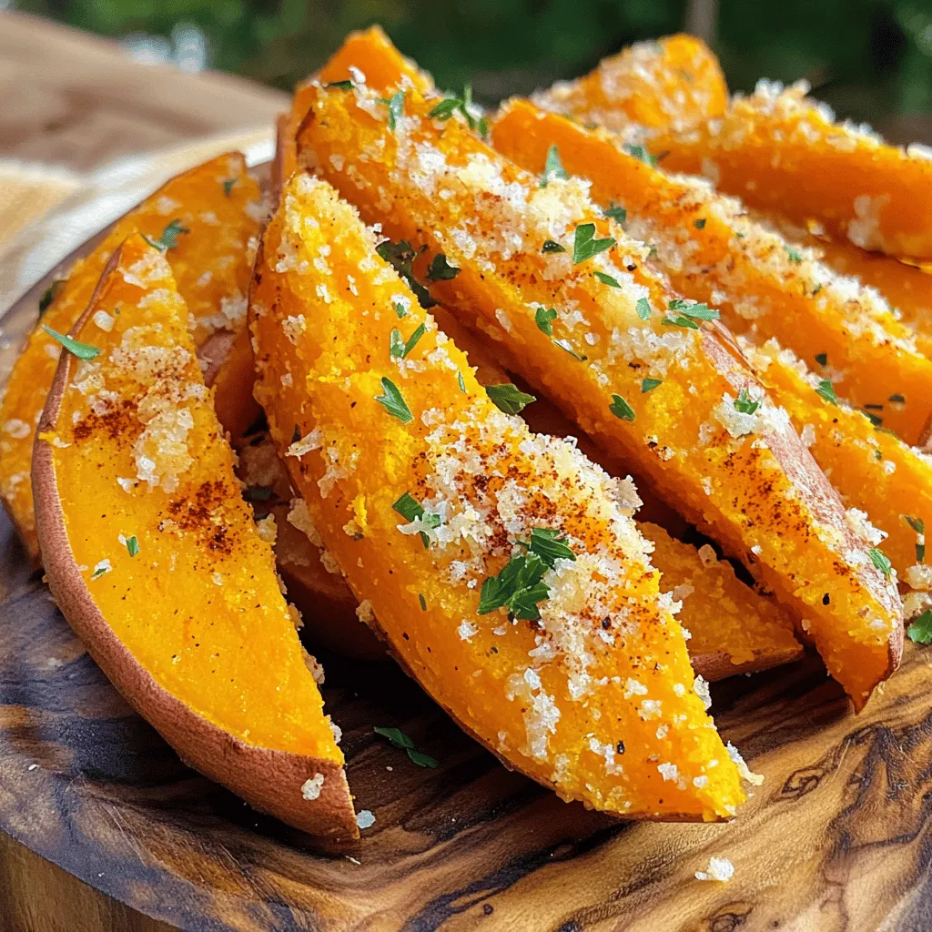 To make Garlic Parmesan Sweet Potato Wedges in the air fryer, you need to gather a few key ingredients. Each ingredient plays an important role in creating a delicious dish. Here’s what you’ll need: - 2 large sweet potatoes, cut into wedges - 3 tablespoons olive oil - 4 cloves garlic, minced - 1 teaspoon smoked paprika - 1 teaspoon garlic powder - ½ teaspoon onion powder - ½ teaspoon salt - ¼ teaspoon black pepper - 1 cup grated Parmesan cheese - 2 tablespoons fresh parsley, chopped (for garnish) Sweet potatoes bring a natural sweetness and a creamy texture. Olive oil helps achieve that crispy exterior. Garlic adds depth of flavor, while smoked paprika gives a nice kick. The blend of garlic powder, onion powder, salt, and pepper rounds out the seasoning. Parmesan cheese offers a cheesy, salty finish, and the fresh parsley gives a bright touch. Each item is important for the final taste. 1. Preheating the air fryer: Start by setting your air fryer to 400°F (200°C). Let it heat for about 5 minutes. This step ensures your sweet potato wedges cook evenly and become crispy. 2. Preparing the sweet potatoes: Take 2 large sweet potatoes and wash them well. Cut them into wedges. Aim for pieces that are similar in size. This way, they cook at the same rate. 3. Mixing the seasoning and cheese: In a large bowl, combine the sweet potato wedges with 3 tablespoons of olive oil, 4 cloves of minced garlic, 1 teaspoon of smoked paprika, 1 teaspoon of garlic powder, ½ teaspoon of onion powder, ½ teaspoon of salt, and ¼ teaspoon of black pepper. Toss everything until the wedges are fully coated. Then, add 1 cup of grated Parmesan cheese and toss again until the cheese sticks to the wedges. 1. Air frying at the right temperature: Place the seasoned sweet potato wedges in your air fryer basket. Make sure they are in a single layer, not crowded. This helps them get crispy. 2. Cooking in batches if necessary: If your air fryer is small, you may need to cook in batches. This way, each wedge gets enough hot air to crisp up nicely. Cook for 15 to 20 minutes. Shake the basket halfway through cooking to ensure even browning. 1. Garnishing with parsley: Once the wedges are golden brown, remove them from the air fryer and place them on a serving platter. Garnish with 2 tablespoons of chopped fresh parsley for a splash of color and added flavor. 2. Serving suggestions: Serve these sweet potato wedges warm. You can sprinkle some extra Parmesan on top for extra flavor. Pair them with your choice of dipping sauce, like zesty spicy mayo or garlic aioli. Enjoy your crunchy, cheesy delight! To make your sweet potato wedges crispy, oil is key. Use just enough olive oil to coat each wedge. Too much oil will make them soggy. Aim for about 3 tablespoons for two large sweet potatoes. Spacing is also vital in the air fryer. Place the wedges in a single layer. If they overlap, they won’t crisp well. Cook them in batches if your air fryer is small. To boost flavors, add spices like chili powder or cayenne for heat. You can also try smoked paprika for a deeper taste. These small changes can make a big difference. For cheese lovers, explore different cheeses. Try cheddar or feta for a unique twist. Each cheese brings its own flavor to the dish. Cooking times may change based on your model of air fryer. Start with 15 minutes, then check for doneness. You want the wedges golden brown and crispy. To check doneness, pierce a wedge with a fork. It should feel tender inside. If it isn’t, give them a few more minutes. Remember, cooking times can vary, so keep an eye on them. {{image_2}} You can change the taste of your sweet potato wedges easily. For a spicy kick, add chili powder or cayenne. This gives the wedges a nice heat. If you prefer sweet flavors, sprinkle some cinnamon and brown sugar on the wedges. The mix of sweet and savory makes each bite special. If you want a vegan version, you can swap the Parmesan cheese. Nutritional yeast is a great choice. It gives a cheesy flavor without dairy. For those who need gluten-free options, you are in luck! This recipe is already gluten-free, so you can enjoy it without worry. These wedges are great on their own, but you can pair them with dips. Try spicy mayo or garlic aioli for a tasty twist. You can also add them to salads or grain bowls. They add a nice crunch and flavor, making your meal more exciting. To keep your leftover garlic Parmesan sweet potato wedges tasty, store them right. Place them in an airtight container. Make sure they cool down first. You can store them in the fridge for up to three days. If you need to stack them, put parchment paper between layers. This keeps them from sticking together. To enjoy your wedges again, reheating is key. The air fryer works best for this. Set it to 350°F (175°C). Heat the wedges for about 5-8 minutes. This helps them regain their crispiness. You can also use an oven. Set it to 375°F (190°C) and warm for 10-15 minutes. You can freeze sweet potato wedges, but timing matters. For the best results, freeze them before cooking. Lay the wedges on a tray and freeze until solid. Then place them in a freezer bag. They can stay fresh for up to three months. If you freeze them after cooking, just note they may lose some texture. To make your sweet potato wedges crispy, start by cutting them evenly. This helps them cook at the same rate. Use a good amount of olive oil. About three tablespoons is perfect. Toss the wedges well with oil and seasonings. Don't overcrowd your air fryer basket. Cook in batches if needed. This allows hot air to circulate. Shake the basket halfway through cooking. This helps all sides get golden and crisp. Yes, you can use regular potatoes! They will have a different taste but will still be delicious. Just cut them into wedges like sweet potatoes. You might need to adjust the cook time. Regular potatoes can take a bit longer. Keep an eye on them to get that nice golden color. There are many tasty dipping sauces 