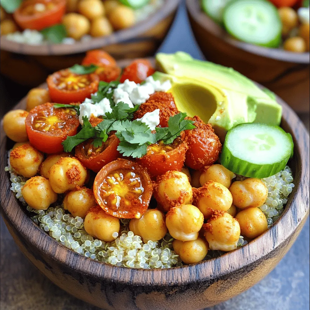 - 2 cans (15 oz each) chickpeas, drained and rinsed - 3 tablespoons harissa paste - 2 tablespoons olive oil - 1 teaspoon garlic powder - 1 teaspoon smoked paprika - Salt and pepper to taste Chickpeas are the star of this dish. They provide protein and fiber. I use two cans for easy prep. Harissa paste adds a spicy kick. Olive oil helps the chickpeas roast well. Garlic powder and smoked paprika boost the flavor. Don't forget salt and pepper for seasoning. - 1 cup cherry tomatoes, halved - 1 cucumber, diced - 1 avocado, sliced - Fresh cilantro or parsley for garnish Fresh ingredients brighten up the bowl. Cherry tomatoes add sweetness and color. Diced cucumber gives a nice crunch. Sliced avocado adds creaminess and healthy fats. Garnish with cilantro or parsley for a fresh touch. - ¼ cup feta cheese, crumbled - 1 cup cooked quinoa Feta cheese adds a salty bite. If you love cheese, go for it! Quinoa serves as a great base. It makes the meal heartier and adds more protein. You can also use other grains if you wish. First, preheat your oven to 425°F (220°C). A hot oven helps the chickpeas get nice and crispy. Make sure to set a timer so you don’t forget! In a large bowl, add the drained chickpeas. Then, mix in 3 tablespoons of harissa paste and 2 tablespoons of olive oil. Add 1 teaspoon of garlic powder, 1 teaspoon of smoked paprika, and sprinkle in salt and pepper to taste. Toss everything well. You want each chickpea to be coated in flavor. Spread the seasoned chickpeas in a single layer on a baking sheet lined with parchment paper. Roast them in the oven for 25 to 30 minutes. Shake the pan halfway through. This helps them cook evenly. Look for a crispy, golden finish. While the chickpeas roast, cook your quinoa. Follow the package instructions for best results. Once it’s done, fluff it with a fork. Set it aside to cool a bit. Grab your serving bowls. Start with a base of cooked quinoa. Then, top it with roasted chickpeas. Add halved cherry tomatoes, diced cucumber, and sliced avocado. Each layer adds color and taste. If you like, sprinkle crumbled feta cheese on top. For a fresh finish, add chopped cilantro or parsley. Serve the bowls warm. An extra drizzle of olive oil or a squeeze of lemon adds even more flavor! To get crispy chickpeas, follow these tips: - Dry the Chickpeas: After rinsing, pat the chickpeas dry with a towel. Moisture makes them soggy. - Use Parchment Paper: Line your baking sheet with parchment. It helps with easy cleanup and even roasting. - Spread Evenly: Make sure the chickpeas are in a single layer. This helps them cook evenly. - Shake Halfway: Halfway through cooking, shake the pan. This lets all sides get crispy. You can change this recipe to fit your needs: - For Vegan: Skip the feta cheese. The dish stays tasty without it. - For Gluten-Free: This recipe is naturally gluten-free. Enjoy it as is. - Different Beans: Use black beans or white beans if you want a change. They work well with harissa. These bowls are great on their own, but you can add more: - Grains: Serve with rice or farro instead of quinoa. - Greens: Add spinach or kale for extra color and nutrition. - Sauces: Drizzle tahini sauce or a yogurt sauce on top for creaminess. - Nuts and Seeds: Sprinkle some pumpkin seeds or nuts for crunch and flavor. {{image_2}} You can change the flavor of your chickpeas easily. Try using different spice blends. Here are some ideas: - Cumin and Coriander: These spices add warmth and depth. - Curry Powder: This gives a nice twist with a hint of sweetness. - Chili Powder: For more heat, this is a great option. - Lemon Pepper: This adds brightness and tang. These blends can make your dish exciting and new. Experiment and find what you like best! While quinoa is tasty, you can switch up the base. Here are some ideas: - Brown Rice: A hearty choice that adds fiber. - Couscous: This cooks quickly and has a nice texture. - Farro: A nutty grain that pairs well with chickpeas. - Cauliflower Rice: For a low-carb option, this works well. Feel free to mix and match these bases. It keeps your meals fun and fresh. Making this dish vegan and gluten-free is simple. Here’s how: - Skip the Feta: Just leave out the cheese for a vegan meal. - Check Labels: Ensure your harissa and other ingredients are gluten-free. - Use Gluten-Free Grains: Choose quinoa, rice, or other gluten-free bases. This dish can fit many diets. You can enjoy it no matter your needs! To keep your Harissa Roasted Chickpea Bowls fresh, store leftovers in an airtight container. Make sure the chickpeas and veggies are cool before sealing. This helps keep the flavors intact. You can store them in the fridge for up to three days. If you want to keep the chickpeas crispy, store them separately from the other ingredients. When you're ready to enjoy leftovers, reheating is key for taste. You can use the oven for best results. Preheat it to 350°F (175°C). Place the chickpeas on a baking sheet and heat for about 10 minutes. This will help them regain some crunch. If you’re in a rush, use the microwave. Heat it for about 1-2 minutes, but the chickpeas may lose their crispiness. Harissa Roasted Chickpea Bowls last for about three days in the fridge. If you want to store them longer, consider freezing the chickpeas. They should keep well for up to three months in the freezer. Just remember to label your containers with the date! This way, you can enjoy these tasty bowls later without any worry. Yes, you can use dried chickpeas. To do this, first soak them overnight in water. This helps them soften. Next, drain and rinse the chickpeas. Cook them in boiling water for about 1 to 1.5 hours until tender. Then, use them in the recipe just like canned chickpeas. Harissa can be spicy, but it varies by brand. Some types are hot, while others are milder. I suggest starting with a small amount. You can always add more if you enjoy the heat. The spices in harissa add depth and flavor, too. These bowls are great with many sides. Yo