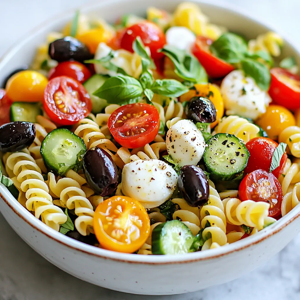 To make a delightful Italian Veggie Pasta Salad, gather the following ingredients: - Pasta Types: - 8 oz (about 2 cups) rotini or farfalle pasta - Fresh Vegetables: - 1 cup cherry tomatoes, halved - 1 medium cucumber, diced - 1 red bell pepper, diced - 1 cup black olives, sliced - 1/4 cup red onion, finely chopped - 1/4 cup fresh basil leaves, chopped - Dressing Components: - 1/4 cup olive oil - 2 tablespoons red wine vinegar (or apple cider vinegar) - 1 teaspoon dijon mustard - 1 teaspoon Italian seasoning - Salt and pepper to taste - Optional Add-Ins: - Additional veggies or proteins like mozzarella balls (bocconcini), chickpeas, or grilled chicken These ingredients create a bright, fresh dish. The pasta serves as a base, while the vegetables add crunch and color. The dressing ties everything together, providing a burst of flavor. You can also customize this salad. Add more veggies or proteins to suit your taste. Enjoy the process of mixing and matching! {{ingredient_image_1}} How to Cook Pasta Al Dente To cook pasta al dente, bring a large pot of salted water to a boil. Add 8 oz of rotini or farfalle pasta. Stir occasionally. Cook according to package directions, usually around 8-10 minutes. The pasta should be firm, not mushy. Rinsing Pasta to Stop Cooking Once the pasta is cooked, drain it in a colander. Rinse it under cold water. This stops the cooking process. It also helps cool the pasta quickly. Cool Down Techniques After rinsing, spread the pasta on a baking sheet. This allows it to cool evenly. You want to avoid clumping. Set it aside while you prep the veggies. Chopping Cherry Tomatoes and Cucumber Take 1 cup of cherry tomatoes and cut them in half. This gives a nice bite. Next, grab a medium cucumber and dice it into small pieces. This adds crunch. Dicing Red Bell Pepper and Red Onion Now, take 1 red bell pepper and remove the seeds. Dice it into small cubes. For the red onion, finely chop 1/4 cup. This adds a sweet bite to the salad. Slicing Olives and Mozzarella Balls Slice 1 cup of black olives. They bring salty flavor to the dish. For the mozzarella, cut 1 cup of mozzarella balls in half. They add creaminess to the salad. Whisking Ingredients Together In a small bowl, add 1/4 cup of olive oil, 2 tablespoons of red wine vinegar, and 1 teaspoon of dijon mustard. Whisk until combined. This forms a smooth dressing. Adjusting Flavor with Seasoning Add salt, pepper, and 1 teaspoon of Italian seasoning to the dressing. Taste and adjust as needed. You want a balanced flavor that enhances the salad. Best Practices for Homemade Dressings Always use fresh ingredients for the best taste. Make your dressing ahead of time to boost the flavor. Store it in the fridge until ready to use. Mixing Ingredients in a Large Bowl In a large bowl, combine the cooled pasta, cherry tomatoes, cucumber, red bell pepper, black olives, mozzarella, red onion, and chopped basil. Ensuring Even Distribution of Ingredients Gently toss the ingredients to mix well. You want every bite to have all the flavors. Importance of Chilling for Flavor Development Cover the salad and refrigerate for at least 30 minutes. This allows the flavors to meld. Serve chilled for the best taste. - How to Avoid Sticky Pasta To keep pasta from sticking, use plenty of water. Aim for 4-6 quarts for 8 oz of pasta. Stir the pasta often in the first few minutes. This helps separate the pieces. - Importance of Salting Pasta Water Always salt your water before adding pasta. Use about 1 tablespoon of salt for every 4 quarts of water. This adds flavor to the pasta. - Cooling Techniques for Pasta After draining, rinse the pasta under cold water. This stops the cooking and cools it down quickly. Spread it out on a baking sheet to cool even faster. - Best Practices for Chopping Efficiency Use a sharp knife for clean cuts. Chop all your veggies in one go. This saves time and keeps your kitchen tidy. - Choosing Fresh Vegetables Look for bright colors and firm textures. Fresh veggies taste better and add crunch. Check for any blemishes or soft spots before buying. - Storing Chopped Veggies Keep chopped veggies in airtight containers. Store them in the fridge for up to three days. This keeps them fresh and ready for your salad. - Ideas for Flavor Enhancements Add a squeeze of lemon juice for brightness. Try different herbs like parsley or oregano for extra flavor. - Seasonal Vegetable Suggestions In summer, add sweet corn or zucchini. In fall, consider roasted butternut squash or Brussels sprouts. This keeps your salad fresh and exciting. - Protein Options to Add for Heartiness For a filling meal, add grilled chicken or chickpeas. You can also use shrimp or diced tofu for a vegetarian twist. This makes the salad more satisfying. Pro Tips Tip for Perfect Pasta: Always cook pasta in a large pot of salted boiling water to enhance flavor and prevent sticking. Chill for Flavor: Allow the salad to chill for at least 30 minutes before serving to let the flavors meld together beautifully. Freshness Matters: Use fresh vegetables and herbs for the best taste; they will elevate the overall freshness of the salad. Customize Your Ingredients: Feel free to swap out veggies or add proteins like grilled chicken or chickpeas for a heartier salad. {{image_2}} To make a Mediterranean veggie pasta salad, add these ingredients: - 1 cup artichoke hearts, chopped - 1/2 cup feta cheese, crumbled - 1/2 cup sun-dried tomatoes, sliced - 1/4 cup fresh parsley, chopped For dressing, use lemon juice instead of vinegar. You can also add a splash of balsamic vinegar for a deeper flavor. This mix brings a bright and tangy taste. The feta cheese adds creaminess that complements the pasta. You can boost your pasta salad with protein. Try adding grilled chicken or shrimp. Cook the chicken until it's golden brown. For shrimp, cook until they turn pink and opaque. Both options add heartiness to the dish. For vegetarian options, chickpeas or tofu work great. If using chickpeas, drain 