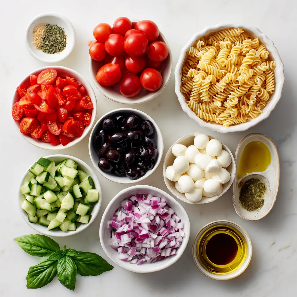 • In a large bowl, combine the cooled pasta, cherry tomatoes, cucumber, red bell pepper, black olives, mozzarella balls, red onion, and basil.