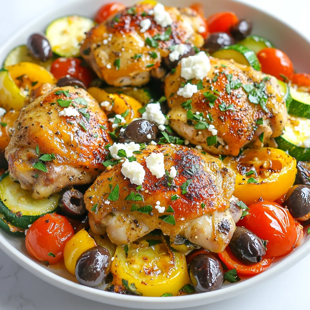 Garnish with crumbled feta and fresh parsley. It adds color and flavor. Serve the chicken with a side salad for crunch. You can also pair it with cauliflower rice for a low-carb option. For extra zing, drizzle some lemon juice over the top. This brightens the dish and enhances the Mediterranean flavors. Enjoy your meal!