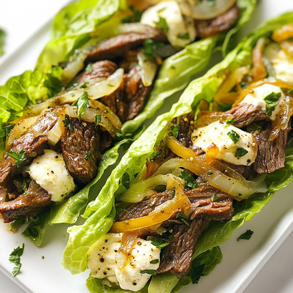 Lay out a lettuce leaf. Spread a generous amount of the cheese mixture on the leaf, add some sautéed vegetables, and top with a portion of the cooked steak. Roll the lettuce leaf tightly from the base to the tip like a burrito.