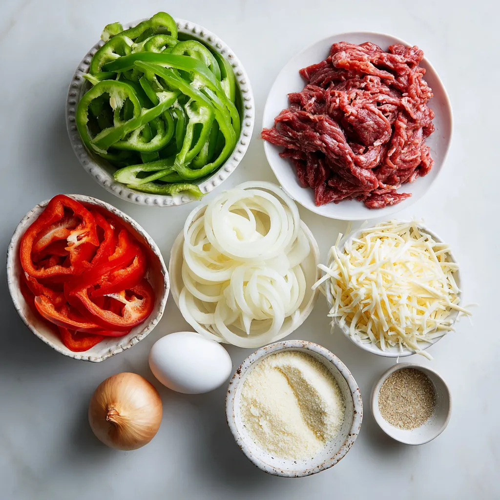 • In a skillet, heat olive oil over medium heat. Add sliced onions and bell peppers, sautéing until softened. Add the shaved beef, cooking until browned. Season with salt and pepper. Remove from heat.