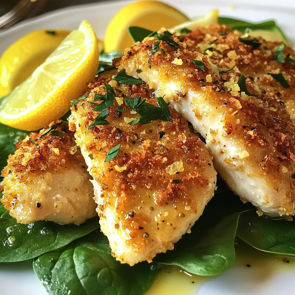 In a large oven-safe skillet, heat olive oil over medium-high heat. Once the oil is hot, add the coated chicken breasts. Cook for 4-5 minutes on each side until they are golden brown and crispy. After that, squeeze the juice of the second lemon over the chicken. Transfer the skillet to the preheated oven. Bake for an additional 10-15 minutes until the internal temperature reaches 165°F (75°C).