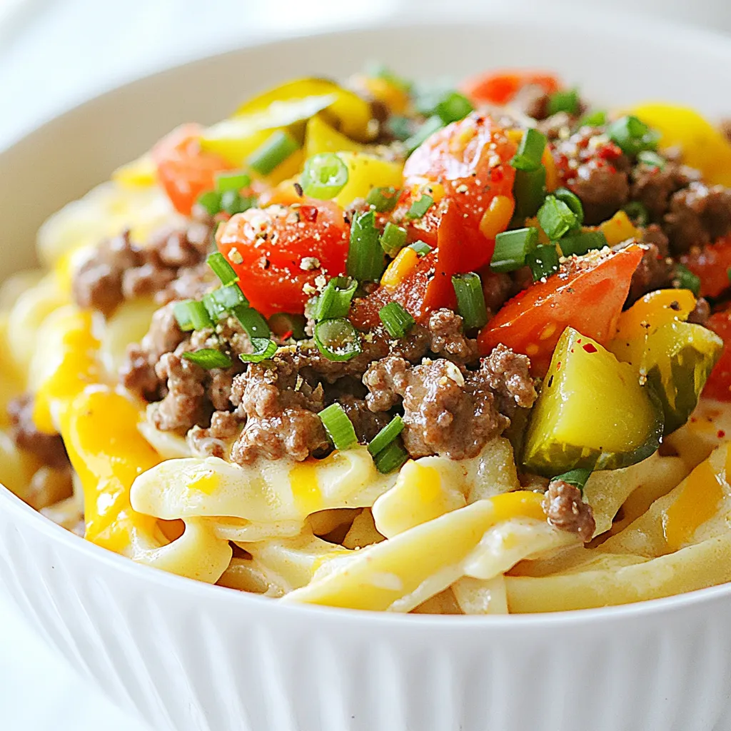 A creamy and cheesy pasta dish loaded with ground beef, topped with fresh tomatoes and pickles.