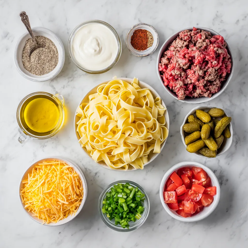 To create this loaded cheeseburger Alfredo, you need some key ingredients. First, grab 8 ounces of fettuccine pasta. This pasta holds the creamy sauce well. Next, use 1 pound of ground beef. It adds the classic cheeseburger flavor. You will also need 2 cups of heavy cream. This makes the dish rich and smooth. For cheesiness, get 1 ½ cups of shredded cheddar cheese. Lastly, don’t forget ½ cup of grated Parmesan cheese for extra depth.
