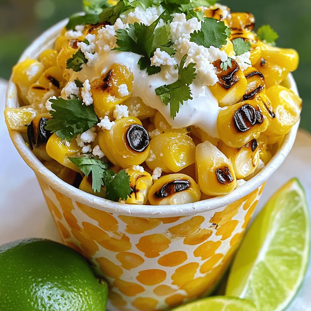 - 4 ears of fresh corn, husked - 2 tablespoons mayonnaise - 2 tablespoons sour cream - 1 tablespoon lime juice - 1 teaspoon chili powder - 1/2 teaspoon garlic powder - Salt to taste - 1/4 cup crumbled cotija cheese - 1/4 cup fresh cilantro, chopped - Lime wedges for garnish The main star of this dish is fresh corn. You want ears that are sweet and juicy. The mayonnaise and sour cream add creaminess. Lime juice brings a zesty kick. Chili powder and garlic powder give it flavor. Cotija cheese adds a salty touch. Cilantro adds freshness. Together, they make a perfect mix. You can get creative with toppings! Here are some ideas: - Extra cotija cheese for more flavor - Sliced jalapeños for a spicy kick - Avocado slices for creaminess - Hot sauce for heat Feel free to mix and match these toppings. They all work well with the corn. Each serving has about: - Calories: 200 - Protein: 4g - Carbohydrates: 24g - Fat: 10g - Fiber: 3g This dish is tasty and offers some nutrition too. The corn provides fiber, which is good for digestion. The cheese and sour cream give you calcium. Enjoying this flavorful treat is a fun way to add veggies to your meal! To make Mexican Corn in a Cup, gather your ingredients first. You need fresh corn, mayonnaise, sour cream, lime juice, chili powder, garlic powder, salt, cotija cheese, and cilantro. This dish takes about 25 minutes total and serves four people. 1. Preheat your grill or a grill pan on medium-high heat. 2. Grill the corn for 10 to 12 minutes. Turn it often. The kernels should get tender and a bit charred. 3. Take the corn off the heat and let it cool for a few minutes. 4. Use a sharp knife to cut the kernels off the cob. Place the kernels in a mixing bowl. 5. In another bowl, combine the mayonnaise, sour cream, lime juice, chili powder, garlic powder, and salt. Mix until smooth. 6. Pour this mixture over the corn kernels. Toss them well to coat. 7. Add in the crumbled cotija cheese and chopped cilantro. Mix gently to distribute evenly. 8. Divide the corn mixture into cups. Top each with extra cotija cheese and cilantro if you like. 9. Serve right away with lime wedges on the side for extra flavor. Mexican Corn in a Cup makes a fun snack or side dish. You can serve it at parties or family gatherings. It pairs well with tacos or grilled meats. Enjoy it fresh for the best taste! When picking corn, look for fresh ears. The husks should be bright green and tight. Gently peel back a bit of the husk. Check if the kernels are plump and milky. Sweet corn is best for esquites. Look for kernels that are yellow or bi-colored. The sweeter, the better! Avoid using old corn. It won't taste sweet and fresh. Don't skip grilling. Grilling adds a nice char and flavor. Be careful not to overcook the corn. You want it tender but not mushy. Mixing the sauce too early can make corn soggy. Wait until you serve to mix. Want to boost flavor? Add more lime juice for zest. A splash of hot sauce can spice it up. Try adding diced jalapeños for heat. You can also mix in some avocado for creaminess. For a smoky touch, use smoked paprika instead of chili powder. Experiment with toppings like diced tomatoes or radishes. {{image_2}} Esquites are already vegetarian, but you can add more veggies. Try diced bell peppers or fresh corn salsa. These add crunch and color to your cup. You can also swap the mayonnaise for a plant-based option. This keeps the creamy taste without dairy. If you love heat, add more chili powder or hot sauce. You can also mix in diced jalapeños for an extra kick. This will make your esquites fiery and fun. Just remember, start small. You can always add more spice later. Cotija cheese gives great flavor, but other cheeses work too. Feta cheese adds a salty bite, while queso fresco offers a milder taste. If you want a creamier option, use goat cheese. Each cheese brings its own twist to your esquites. Experiment with these variations to find your favorite way to enjoy Mexican corn in a cup! To store leftovers of Mexican Corn in a Cup, let it cool first. Place it in an airtight container. This helps keep it fresh for up to three days in the fridge. If you plan to store it, avoid adding lime juice or cilantro until you are ready to eat. This keeps the flavors bright. When you want to enjoy your esquites again, take it out of the fridge. You can reheat it in a pan over medium heat. Add a splash of water to keep it moist. Stir gently until it's warm. You can also use the microwave. Heat in short bursts of 30 seconds, stirring in between. If you want to freeze esquites, do it right after making it. Place the corn mixture in a freezer-safe bag. Remove as much air as you can before sealing. This helps prevent freezer burn. It can last about two months in the freezer. When ready to eat, thaw overnight in the fridge. Then, reheat as mentioned earlier. Enjoy your tasty treat! Esquites is a popular Mexican snack made with corn. It features grilled corn kernels mixed with creamy sauce and spices. You enjoy it served in a cup. This dish often includes cotija cheese, lime, and cilantro, giving it a fresh taste. Each bite is sweet, tangy, and savory. It’s a perfect treat for warm days or gatherings. You can find it sold by street vendors in Mexico. Yes, you can prepare Esquites ahead of time. Cook and mix the corn with the creamy sauce. Store it in the fridge for up to two days. Just remember to add fresh cilantro and cheese before serving. This keeps the flavors bright and lively. You might want to squeeze fresh lime on top right before you eat it. You can buy Esquites from many street vendors in Mexico. In the U.S., look for it at Mexican restaurants or food trucks. Some grocery stores may sell pre-packaged Esquites in the deli section. You might also find it at local farmers' markets during corn season. If you want the real deal, try making it at home. It’s simple and fun! This article covered everything you need to make delicious Esquites. We explored the key ingredients, opt