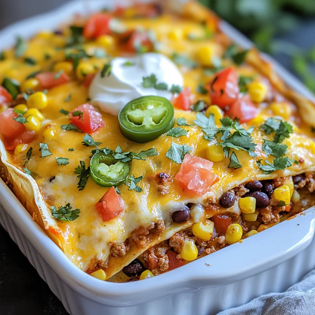 A delicious layered dish combining corn tortillas, seasoned meat, beans, and cheese for a festive meal.