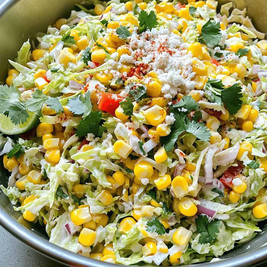 To make this tasty coleslaw, you need simple yet fresh ingredients. Here’s what you’ll need: - 4 cups green cabbage, shredded - 2 cups cooked corn kernels (fresh or canned) - 1 cup red bell pepper, diced - 1/2 cup red onion, finely chopped - 1/2 cup cotija cheese, crumbled (or feta as a substitute) - 1/4 cup fresh cilantro, chopped - 1/2 cup mayonnaise - 2 tablespoons lime juice - 1 teaspoon chili powder - 1 teaspoon garlic powder - Salt and pepper to taste These ingredients give the coleslaw its crunchy texture and bright flavor. The cabbage and corn shine together, while the peppers add color and sweetness. The cotija cheese adds a creamy touch. You can take this coleslaw to the next level by adding a few optional ingredients. Here are some ideas: - Jalapeños for heat - Avocado for creaminess - Black beans for protein - Corn chips for crunch - Extra lime juice for zest Feel free to get creative! These add-ins can enhance flavors and textures. This coleslaw is not only delicious but also offers nutrition. Here’s a quick overview: - Calories: About 200 per serving - Protein: 5 grams - Fiber: 3 grams - Fat: 10 grams - Carbs: 25 grams The fresh veggies provide vitamins, and the cheese adds calcium. You can enjoy this dish as a side or a light meal. Start by shredding the green cabbage. You need about 4 cups. Use a sharp knife or a box grater for this task. Next, grab 2 cups of cooked corn kernels. You can use fresh corn or canned corn. Then, dice one cup of red bell pepper. This will add a nice crunch and color. Finally, finely chop half a cup of red onion. This will give your coleslaw a great flavor. In a separate bowl, combine half a cup of mayonnaise and 2 tablespoons of lime juice. Whisk them together until smooth. Next, add 1 teaspoon of chili powder and 1 teaspoon of garlic powder. Don’t forget to add salt and pepper to taste. Mix it all well until the dressing is creamy and flavorful. Now, combine the vegetable mixture with the dressing. Pour the dressing over the cabbage, corn, bell pepper, and onion. Toss everything gently. You want each piece to be coated well. After that, add half a cup of crumbled cotija cheese and a quarter cup of chopped cilantro. Mix gently again to incorporate these last ingredients. Let the coleslaw chill in the fridge for 15 to 20 minutes. This lets all the flavors blend together. Serve it cold for a tasty side dish! You can easily make this coleslaw your own. Try adding diced jalapeños for heat. Grated carrots add color and sweetness. You can swap the cotija cheese for feta or even goat cheese. If you like crunch, toss in some chopped nuts. Each tweak brings a new taste! Start by washing all your veggies. This step is key for freshness. Shred the cabbage thinly for the best texture. Dice the red bell pepper small for even bites. If using fresh corn, grill it first for a smoky flavor. Prepping ahead makes assembly quick and easy. Serve the coleslaw cold for the best taste. It pairs well with grilled meats like chicken or steak. Use it as a topping for tacos or burritos. For a fiesta feel, add lime wedges on the side. This coleslaw brings color and joy to any meal! {{image_2}} To add some heat to your coleslaw, try the spicy version. You can use more chili powder or add diced jalapeños. This gives a nice kick. It works well with the creamy dressing. You can also mix in some hot sauce if you like. Adjust the spice to fit your taste. This variation is great for those who enjoy bold flavors. For a vegan twist, swap out the mayonnaise for a plant-based option. You can use vegan mayo or a blend of cashews and lemon juice. It keeps the creamy texture while being dairy-free. For cheese, try using nutritional yeast. This adds a cheesy flavor without using dairy. You can also pack in more veggies, like shredded carrots or radishes. If you want more protein, add grilled chicken. Cook the chicken and slice it thinly. Toss it in with the coleslaw before serving. This makes it a complete meal. The chicken pairs well with the flavors of the coleslaw. It also adds a nice texture. You can use any protein you like, such as shrimp or tofu, too. To keep your Mexican street corn coleslaw fresh, place it in an airtight container. Make sure the lid seals tightly. This helps prevent air from getting in and keeps the flavors strong. Store it in the fridge for up to three days. For best taste, eat it within this time. If you know you won't finish it, consider other options. You can freeze coleslaw, but with some notes. The texture may change after thawing. To freeze, place coleslaw in a freezer-safe bag or container. Remove as much air as possible. Label the bag with the date. It can last for about two months in the freezer. When ready to eat, thaw in the fridge overnight. Once thawed, mix it well before serving. Coleslaw tastes best when fresh. In the fridge, it stays good for about three days. After this, the cabbage may become soggy, and flavors fade. Always check for any off smells or changes in color. If you see these signs, it’s best to discard it. For frozen coleslaw, use it within two months for optimal flavor. Yes, you can use frozen corn. It is convenient and saves time. Just thaw it first. Drain any extra water before mixing it with the other ingredients. Frozen corn gives a nice sweet taste, just like fresh corn. Cotija cheese is a crumbly, salty cheese from Mexico. It adds a great flavor to the coleslaw. If you can't find cotija, you can use feta cheese as a substitute. Feta will give a similar salty taste but has a creamier texture. The coleslaw lasts about 3 to 5 days in the fridge. Store it in an airtight container to keep it fresh. The flavors will blend and get even better over time. Just give it a good stir before serving again. This blog post covered how to make Mexican street corn coleslaw, including ingredients, tips, and storage methods. We explored the main ingredients and optional add-ins for more flavor. I shared step-by-step instructions for