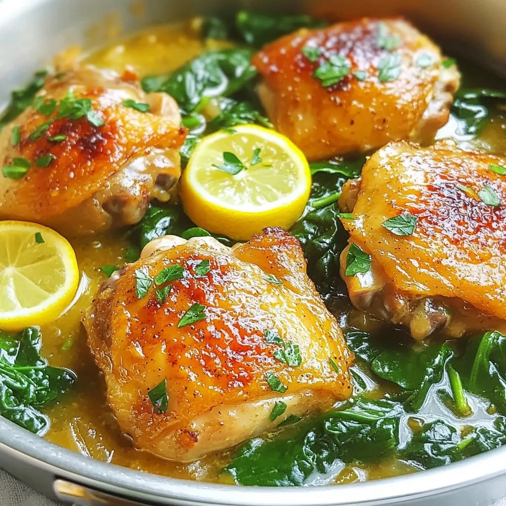 A delicious and easy one-pan meal featuring chicken thighs, garlic, and spinach with a bright lemon flavor.