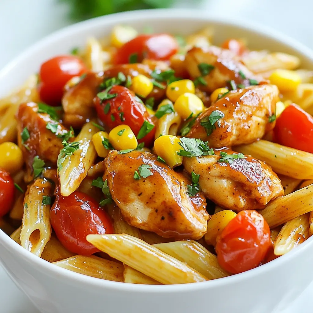 A delicious and easy one-pot pasta dish featuring chicken, BBQ sauce, honey, and fresh vegetables.