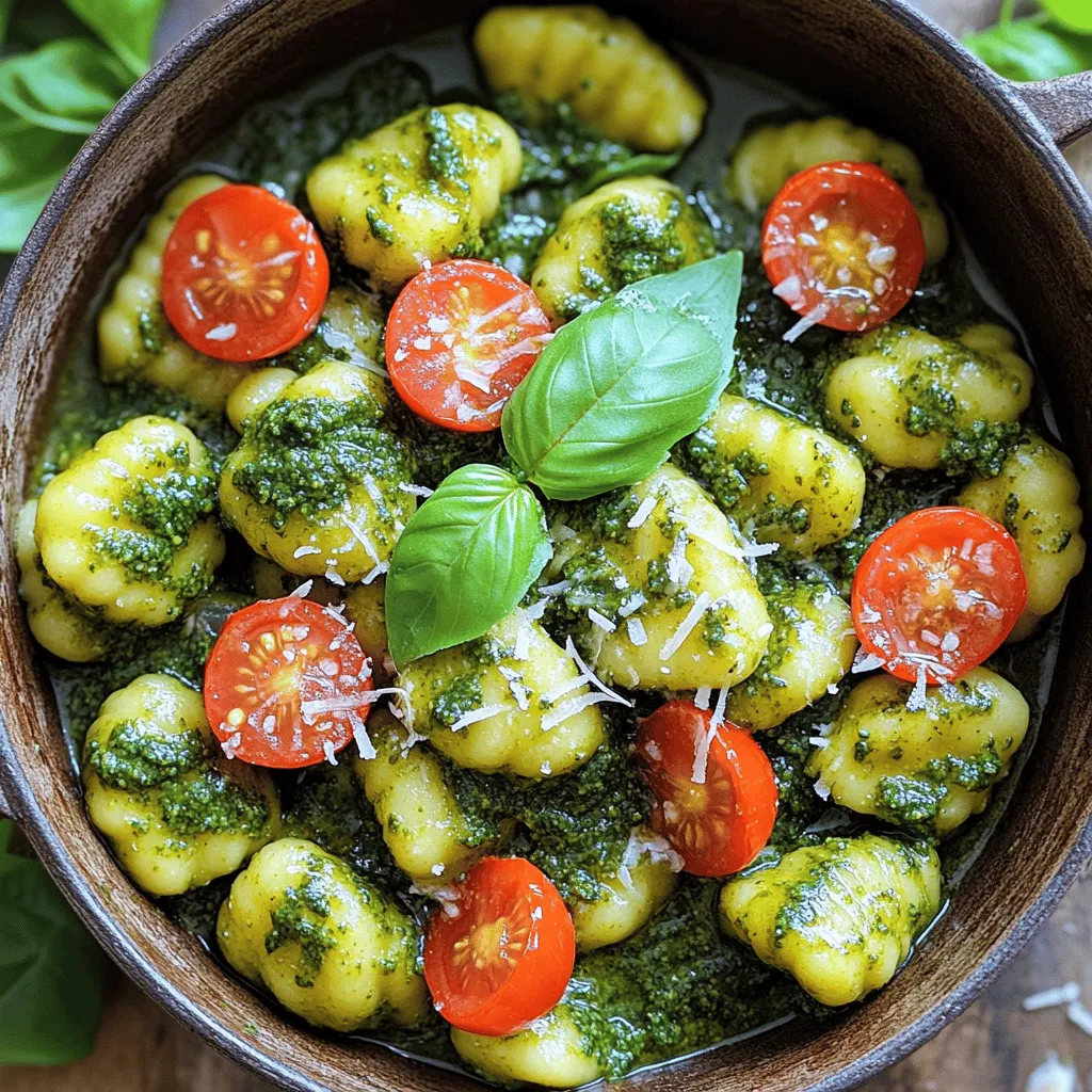 - 1 lb potato gnocchi - 2 cups baby spinach - 1 cup basil pesto (store-bought or homemade) - 1 cup cherry tomatoes, halved - 2 cloves garlic, minced - 1 tablespoon olive oil - 1/2 cup vegetable broth - 1/4 cup grated Parmesan cheese (optional) - Salt and pepper to taste - Fresh basil leaves for garnish These ingredients create a tasty dish. The potato gnocchi is soft and chewy. Baby spinach adds great color and nutrients. The basil pesto gives it a rich flavor. Cherry tomatoes burst with sweetness. Garlic adds a nice kick. Olive oil helps the flavors blend. Vegetable broth keeps everything moist. Parmesan cheese adds creaminess, but it’s optional. - Pine nuts or walnuts for crunch - Lemon zest for brightness - Red pepper flakes for heat Adding crunch with nuts makes it exciting. Lemon zest lifts the dish's flavor. If you like spice, red pepper flakes add great heat. - Cauliflower gnocchi for a low-carb option - Kale instead of spinach for a different green - Chicken broth instead of vegetable broth for more flavor - Nutritional yeast instead of cheese for a vegan option You can swap ingredients to fit your needs. Cauliflower gnocchi is a tasty choice. Kale gives you more texture. Chicken broth adds depth. Nutritional yeast is a great cheese substitute for vegans. This flexibility makes the dish fun and easy! First, grab a large pot or deep skillet. Heat one tablespoon of olive oil over medium heat. When the oil shimmers, add two minced garlic cloves. Sauté them for about one minute. You want the garlic to smell great, but don’t let it burn. After that, pour in half a cup of vegetable broth. Let it come to a gentle simmer. Next, add one pound of potato gnocchi to the pot. Cook them according to the package instructions. This usually takes about two to three minutes. You’ll know they are done when they start floating to the surface. That’s the sign they are ready! Now, it’s time to bring it all together. Stir in one cup of halved cherry tomatoes and two cups of baby spinach. Cook this mix for about one to two minutes, just until the spinach wilts. After that, take the pot off the heat. Add one cup of basil pesto and stir until everything is well-coated. If you like, sprinkle a quarter cup of grated Parmesan cheese on top. Finally, season with salt and pepper to taste. Don’t forget to garnish with fresh basil leaves before serving! Making pesto at home is fun and easy. You need fresh basil, garlic, nuts, cheese, and olive oil. Here’s how to do it: - 2 cups fresh basil leaves - 2 cloves garlic - 1/4 cup pine nuts (or walnuts) - 1/2 cup grated Parmesan cheese - 1/2 cup olive oil - Salt to taste 1. Blend the basil, garlic, and nuts until fine. 2. Add the cheese and pulse a few times. 3. Slowly drizzle in the olive oil while blending. 4. Season with salt to taste. Homemade pesto is bright and fresh. It adds a great flavor to your gnocchi. You can change the texture and flavor of your dish easily. If you want a creamier sauce, add more olive oil or a splash of cream. To make it lighter, use less pesto. If you love a strong garlic taste, add more minced garlic. - For a tangy flavor, squeeze some lemon juice into the mix. - If you prefer a chunky texture, blend less. Taste as you go! Adjust until it is just right for you. How you serve your One Pot Pesto Gnocchi can make it special. Here are a few ideas: - Serve it warm in bowls, topped with fresh basil leaves. - Sprinkle extra Parmesan cheese on top for a cheesy kick. - Add a side salad for a fresh crunch. This dish is perfect for family dinners or casual get-togethers. It’s easy to make and always a hit! {{image_2}} You can make this dish heartier by adding protein. Try cooked chicken, shrimp, or sausage. Each option adds a new flavor. Simply cook the protein in olive oil before adding garlic. Then follow the recipe as usual. This will enhance the meal and keep you full longer. Feel free to swap in different veggies based on your taste. Zucchini, bell peppers, or broccoli work great. Just chop them into bite-sized pieces. Add them when you add the spinach. They will cook just right and add color to your dish. Want to make it vegan? It’s easy! Use a vegan pesto instead of regular pesto. Swap the Parmesan for nutritional yeast or leave it out. This gives the dish a cheesy flavor without dairy. Follow the same steps, and enjoy a dairy-free meal! You can store leftover One Pot Pesto Gnocchi in the fridge. Place it in an airtight container. It stays fresh for up to three days. Make sure it cools down before sealing. This helps keep the flavors intact. When you are ready to eat, check for any signs of spoilage. Freezing this dish is a great option for longer storage. Allow it to cool completely first. Then, transfer the gnocchi to freezer-safe bags or containers. Remove as much air as possible to prevent freezer burn. It can last for about two months in the freezer. Remember to label the containers with a date for easy tracking. Reheat your One Pot Pesto Gnocchi gently to keep it tasty. For the best results, use a skillet. Add a splash of vegetable broth or water to help it heat evenly. Stir it on low heat until warm. If you prefer, you can also use the microwave. Just cover it loosely and heat in short bursts, stirring in between. This keeps the gnocchi from drying out. Enjoy your flavorful meal! Cooking gnocchi is quick and easy. It takes about 2-3 minutes. Once the gnocchi floats, it is ready. You can watch for this sign to know it's done. This fast cooking makes it a perfect dish for busy nights. Yes, you can! Feel free to use any pesto you enjoy. Sun-dried tomato pesto or arugula pesto work well too. Each type will change the dish's flavor a bit. Experimenting with different pestos can be fun and tasty! The gnocchi made from wheat is not gluten-free. However, you can find gluten-free gnocchi at many stores. Just swap it out for the regular kind. This way, you can still enjoy the dish while keeping it gluten-free. This blog post