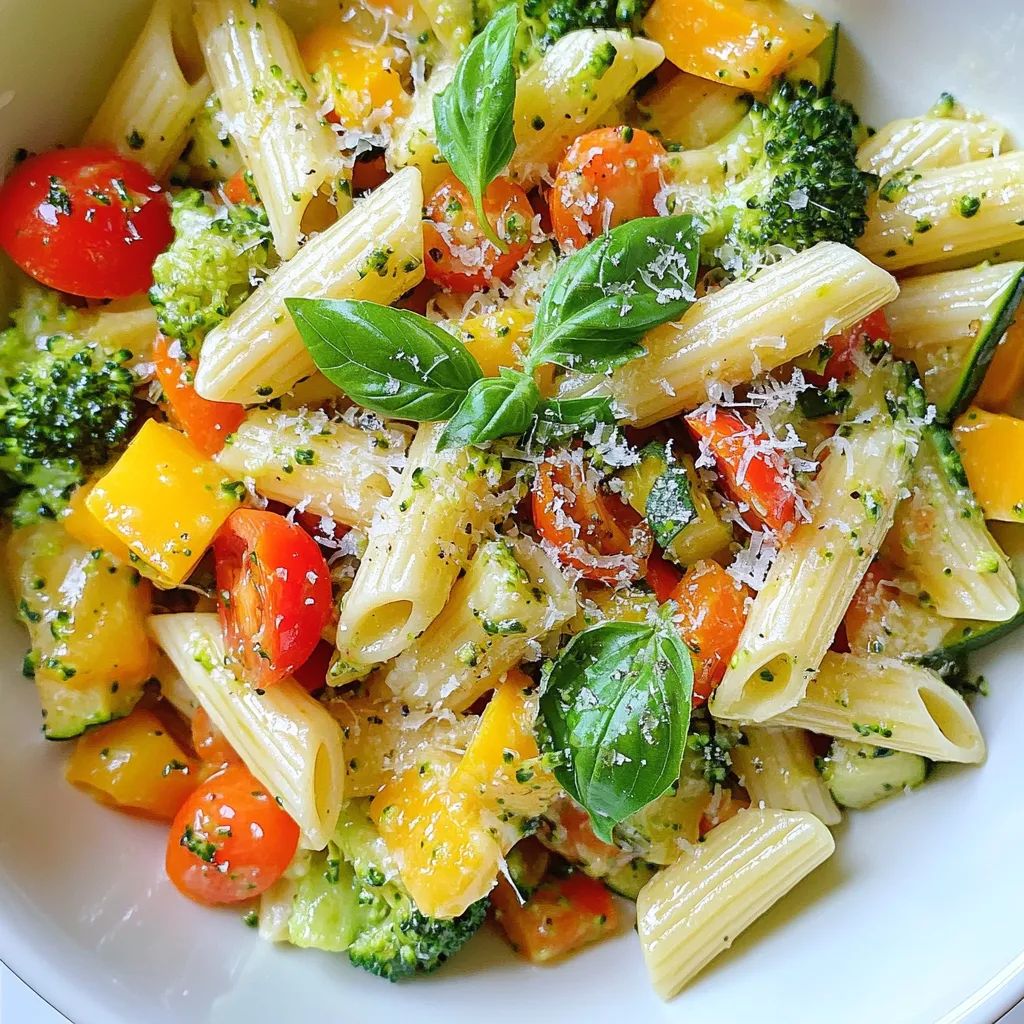 A vibrant and fresh pasta dish loaded with colorful vegetables and herbs.