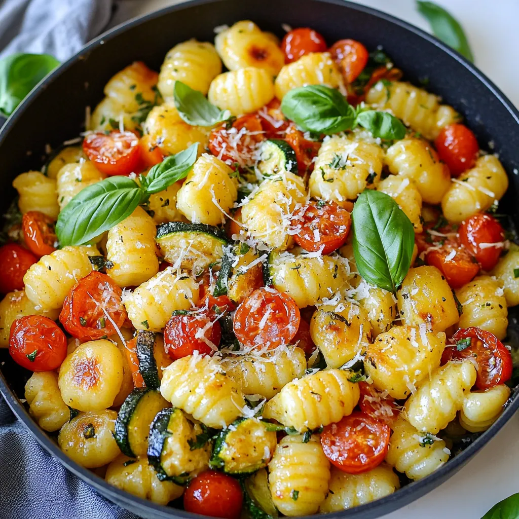A delicious and easy skillet dinner featuring potato gnocchi and fresh vegetables.