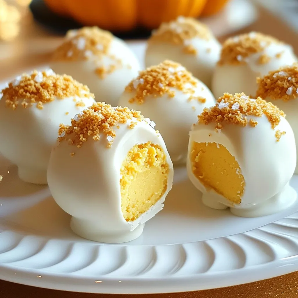 Delicious bite-sized truffles made with pumpkin and cream cheese, coated in white chocolate.