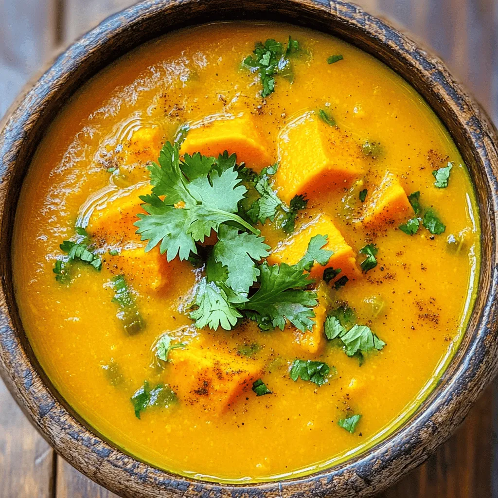 - 1 small pumpkin, peeled, seeded, and cut into cubes - 2 medium sweet potatoes, peeled and cubed - 1 large onion, chopped - 3 cloves garlic, minced - 4 cups vegetable broth - 1 can (400ml) coconut milk - 1 tablespoon olive oil - 1 teaspoon ground ginger - 1 teaspoon ground cinnamon - ½ teaspoon nutmeg - Salt and pepper to taste - Fresh cilantro - Fresh parsley In this pumpkin sweet potato soup, you start with a small pumpkin. Peel it and cut it into cubes. This pumpkin brings a rich, sweet flavor. Next, grab two medium sweet potatoes. Peel and cube them too. They add creaminess and depth to the soup. Chop one large onion and mince three cloves of garlic. These add a savory base to your soup. For the broth, use four cups of vegetable broth. This keeps the soup light and tasty. Now for the extra ingredients. A can of coconut milk makes the soup creamy and smooth. Just one tablespoon of olive oil helps sauté the onion and garlic. You’ll need a teaspoon each of ground ginger and cinnamon. These spices warm the soup's flavor. A pinch of nutmeg adds a nice touch. Finally, season with salt and pepper to bring it all together. For a bright finish, consider garnishing with fresh cilantro or parsley. These herbs add color and a fresh taste. You can mix and match these ingredients based on your taste. Enjoy the process of making this comforting bowl! To start, you need to prepare your ingredients. - Peel and cube 1 small pumpkin. - Peel and cube 2 medium sweet potatoes. - Chop 1 large onion and mince 3 cloves of garlic. This step makes cooking easier. Having everything ready saves time and helps you focus on the flavors. Now, let’s get cooking! - In a large pot, heat 1 tablespoon of olive oil over medium heat. - Add the chopped onion and sauté for about 5 minutes. You want it to be soft and translucent. - Stir in the minced garlic, 1 teaspoon of ground ginger, 1 teaspoon of ground cinnamon, and ½ teaspoon of nutmeg. Add salt and pepper to taste. Keep sautéing for another 2 minutes until you smell those warm spices. Next, it’s time for the pumpkin and sweet potatoes. - Add the cubed pumpkin and sweet potatoes to the pot. Stir well to coat them with the spices. - Pour in 4 cups of vegetable broth and bring this mixture to a boil. - Once it boils, lower the heat, cover the pot, and let it simmer for about 20-25 minutes. Cook until the pumpkin and sweet potatoes are tender. When everything is soft, we need to blend! - Remove the pot from heat. Use an immersion blender to puree the soup until smooth. If you don’t have one, carefully transfer batches to a standard blender. Blend until it’s creamy. Now, let’s add some creaminess. - Return the soup to the pot and stir in 1 can (400ml) of coconut milk. - Warm it over low heat for another 5-10 minutes. Adjust the seasoning if needed. Finally, serve the soup hot in bowls. You can garnish with fresh cilantro or parsley if you like. Enjoy your comforting bowl of pumpkin sweet potato soup! Cutting pumpkin can be tricky. First, always use a sharp knife. This helps you cut through the tough skin. To peel, cut the pumpkin in half. Scoop out the seeds with a spoon. Place the flat side down when cutting into cubes. This keeps the pumpkin steady and safe. Choose a small pumpkin. It has sweeter flesh and is easier to handle. Look for one that feels heavy for its size and has a firm skin. Getting the flavor just right makes this soup shine. Use one teaspoon of ground ginger, cinnamon, and half a teaspoon of nutmeg. These spices add warmth and depth. If you want more creaminess, add more coconut milk. This will make the soup rich and smooth. Taste often as you cook. Adjust salt and pepper to fit your taste. A good blender is key for smooth soup. I recommend an immersion blender. This tool is easy to use right in the pot. If you prefer a standard blender, do it in small batches. For pots, choose a heavy-bottomed one. It helps heat evenly and prevents scorching. A 4-quart pot works great for this recipe. {{image_2}} You can make your pumpkin sweet potato soup even better with seasonal add-ins. Adding carrots brings a nice sweetness and a pop of color. Just peel and chop them, then add them with the pumpkin and sweet potatoes. You can also add diced potatoes for a heartier soup. Incorporating seasonal herbs can elevate the soup's flavor. Try adding fresh thyme or sage. These herbs pair well with pumpkin and add depth. Simply toss them in during the final cooking stages to keep their bright taste. If you need vegan options, swap the coconut milk with cashew cream. This keeps the soup creamy without dairy. You can make cashew cream by soaking cashews and blending them with water. For a gluten-free option, this soup is naturally gluten-free. Just ensure your vegetable broth is gluten-free as well. You can cook this soup in various ways. For a slow cooker, add all ingredients to the pot and set it to low for 6-8 hours. This method enhances the flavors over time. For an Instant Pot adaptation, combine the ingredients and set it to manual for 10 minutes. Once done, let the steam release naturally for about 10 minutes. This method saves time while still giving you that rich flavor. Try these variations to keep your soup exciting and tailored to your taste! To keep your soup fresh, use airtight containers. Glass or plastic containers work well. Make sure the soup cools before sealing the lid. Store the soup in the fridge for later enjoyment. You can freeze this soup for later. Let it cool completely before pouring it into freezer-safe bags or containers. Make sure to leave some space at the top, as the soup will expand. When ready to eat, thaw the soup in the fridge overnight. Reheat it on the stove over low heat until warm. This delicious soup lasts about 4-5 days in the fridge. Keep an eye out for any changes in color or smell. If the soup smells off or has mold, it’s best to toss it. Enjoy your tasty meal safely! Yes, you can use canned pumpkin. It saves time