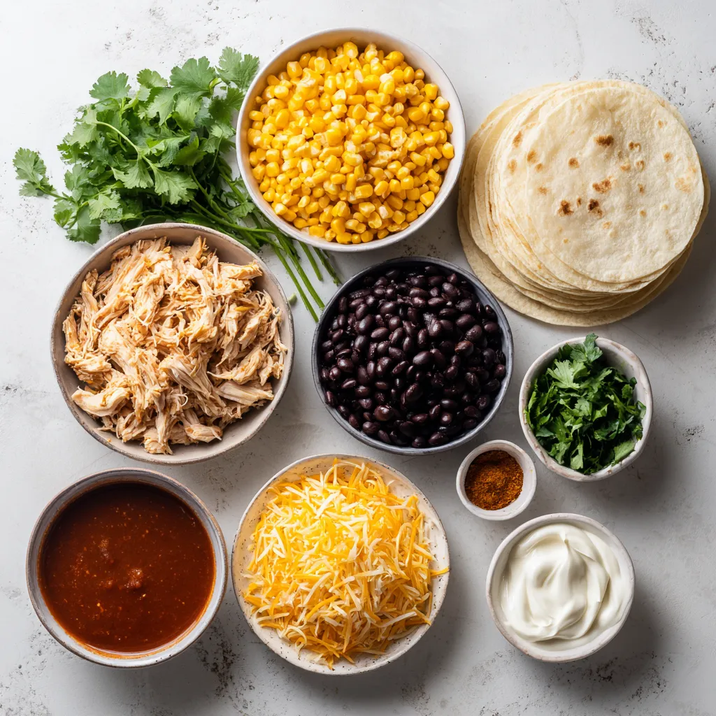 When making quick chicken enchiladas, gather all your ingredients first. This helps you stay organized and makes cooking easier. You need shredded chicken, which can be from a rotisserie or boiled chicken. Black beans add texture and protein. Rinse them well to remove excess sodium. Corn gives a sweet crunch. You can use fresh or frozen corn for this recipe.
