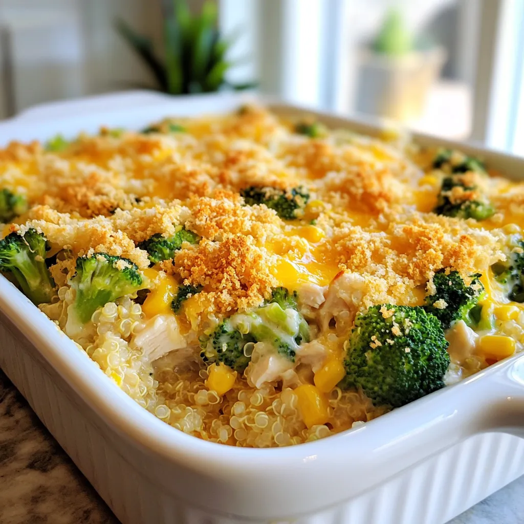 A comforting casserole made with shredded rotisserie chicken, quinoa, and vegetables, topped with cheese.