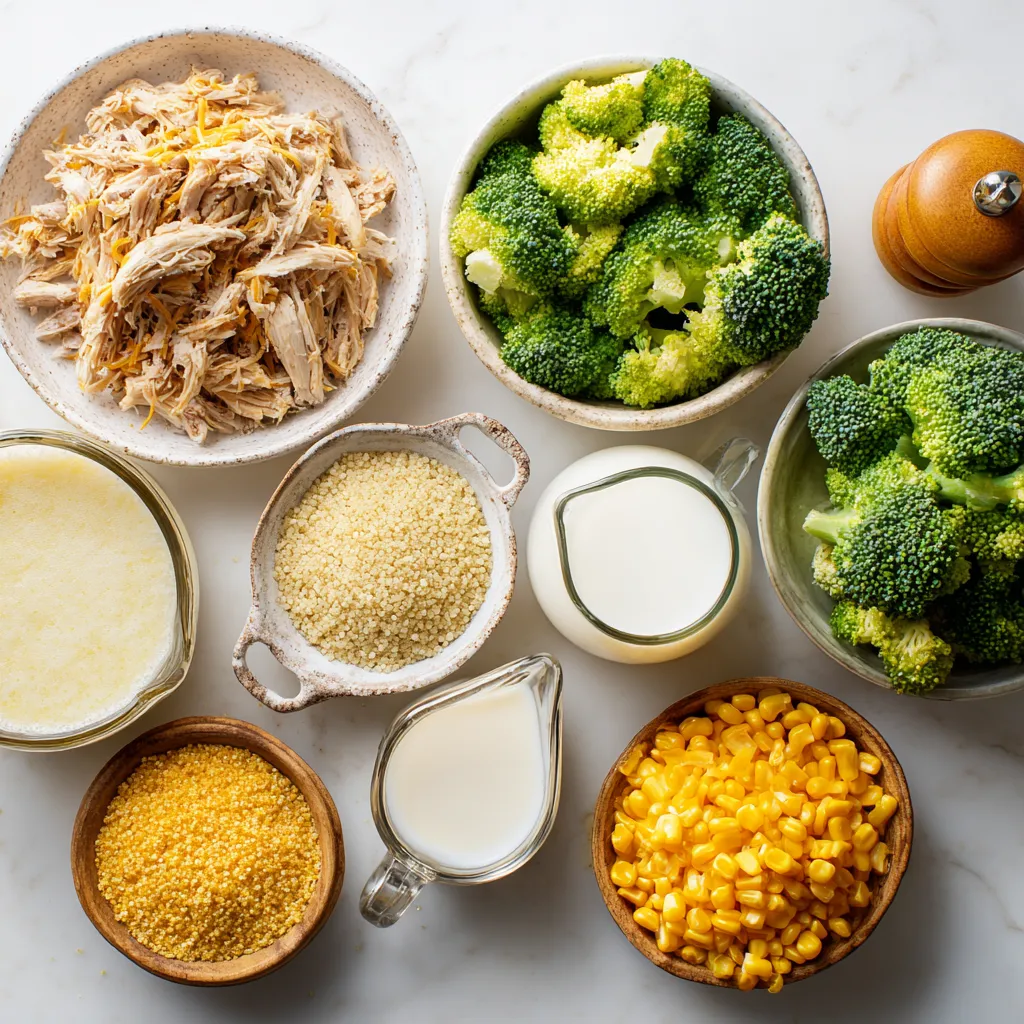 In a large mixing bowl, combine the shredded rotisserie chicken, cooked quinoa, steamed broccoli, frozen corn, cream of mushroom soup, and milk.