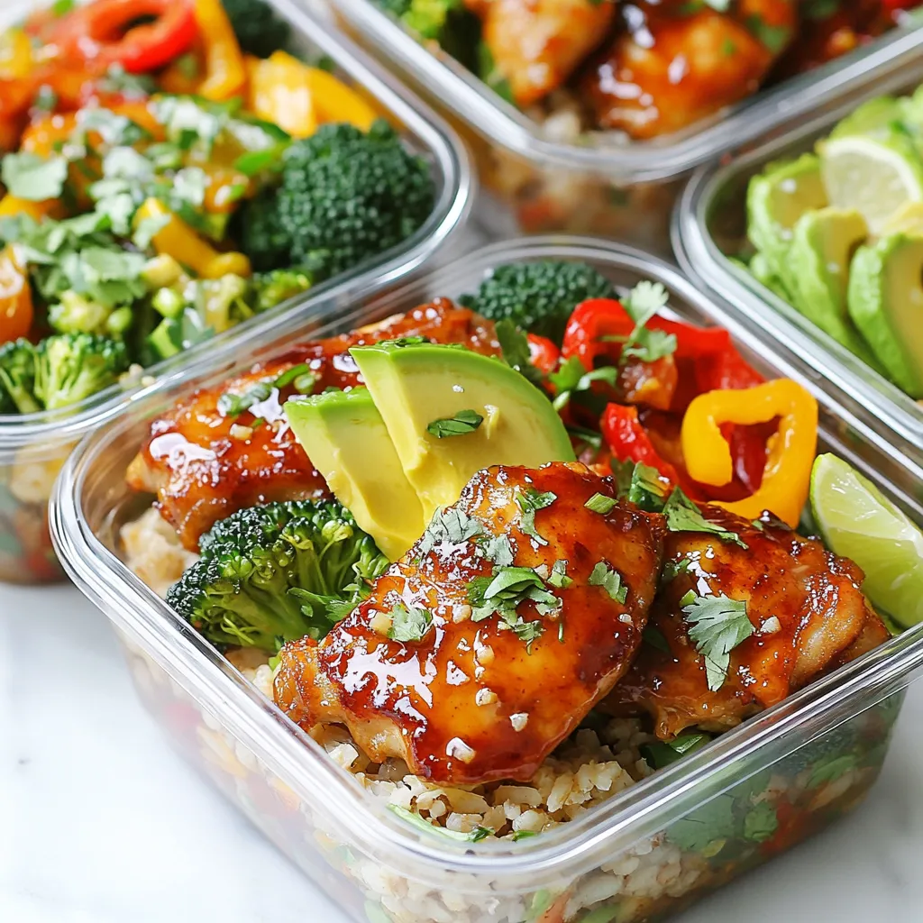 A flavorful meal prep bowl featuring spicy honey glazed chicken, served with brown rice or quinoa, steamed broccoli, and sautéed bell peppers.