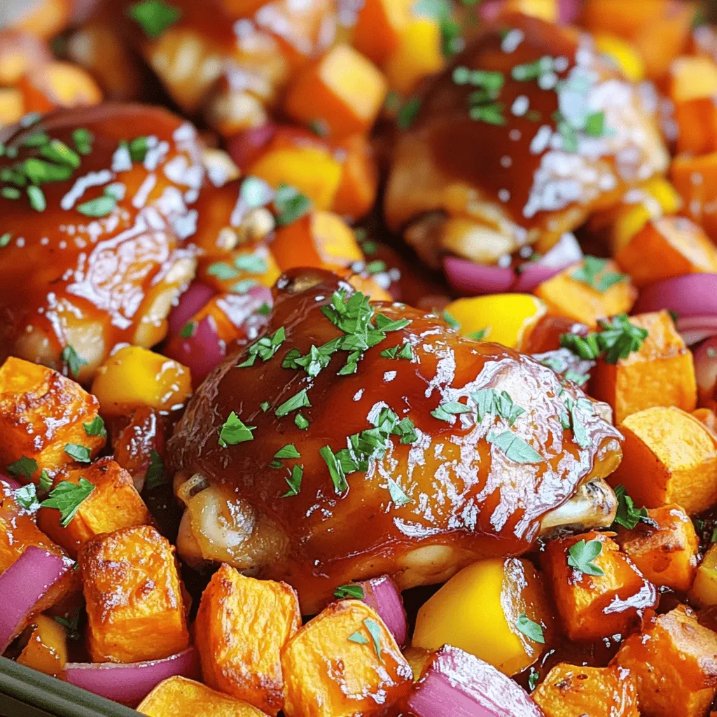 To cook chicken thighs just right, start by drying them with paper towels. This step helps the skin crisp up nicely. Season them well with salt, pepper, and olive oil. Brush on BBQ sauce generously to add flavor. Bake the chicken on top of the sweet potatoes and peppers. This allows the juices to drip down, keeping everything moist. Use a meat thermometer to check the chicken’s temperature. It should reach 165°F (75°C). If you want even more flavor, glaze with extra BBQ sauce in the last few minutes of baking.